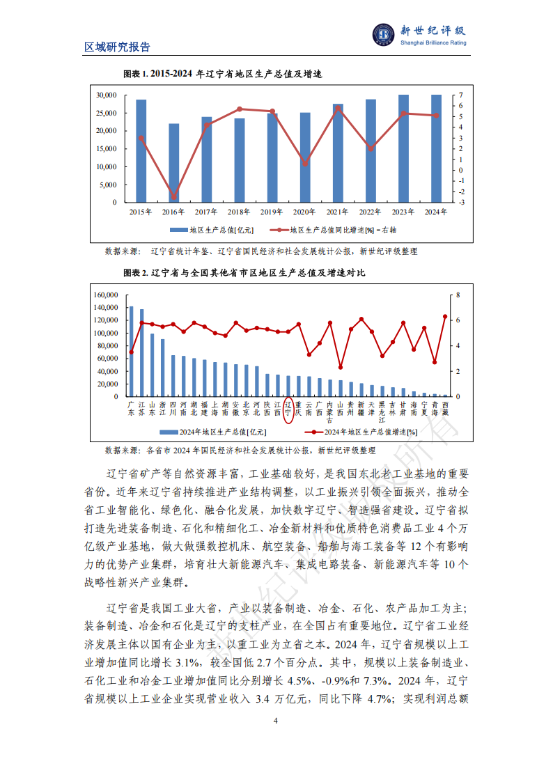 稳步增长;规模以上工业增加值同比增长3.1%,低于全国2.7个百分点;规模以上工业企业营业收入和利润总额同比双降。2024年,辽宁省经济增长主要依赖投资及消费增长的推动,外贸进出口负增长对经济有所拖累。2025年前三季度,辽宁省实现地区生产总值2.4万亿元,按不变价格计算,同比增长4.3%,低于全国0.9个百分点。辽宁省传统工业占比较大,对国有企业较为依赖,民营经济发展不充分,一定程度上制约了地区经济发展的活跃性,产业转型压力较大。