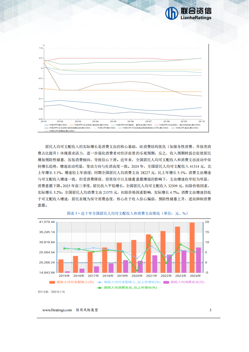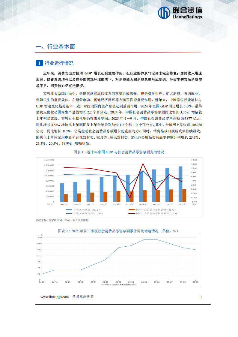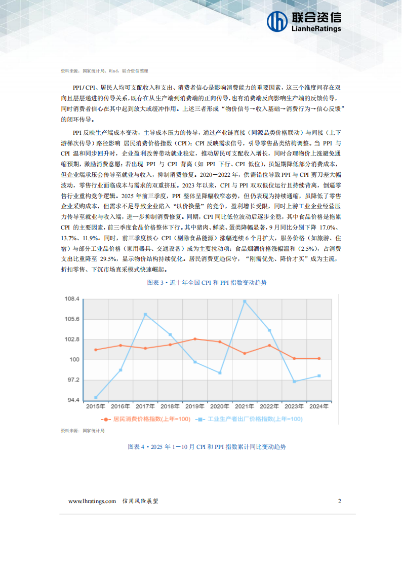 零售业关系国计民生,是现代商贸流通体系的重要组成部分,也是引导生产、扩大消费、吸纳就业、保障民生的重要载体,在繁荣市场、畅通经济循环等方面发挥着重要作用。近年来,中国零售行业增长与GDP增速变化趋势基本一致,对拉动国内生产总值起到重要作用,2024年全国GDP同比增长5.0%,最终消费支出拉动国内生产总值增长2.2个百分点。2024年,中国社会消费品零售总额同比增长3.5%,增幅较上年明显放缓,零售行业景气度仍有恢复空间。2025年1-9月,中国社会消费品零售总额365877亿元,同比增长4.5%,增速比上年同期及上年全年分别加快1.2个和1.0个百分点。其中,全国网上零售额108930亿元,同比增长8.6%,仍是拉动社会消费品总额增长的重要动力。同时,消费品以旧换新政策持续显效,限额以上单位家用电器和音像器材类、家具类、通讯器材类、文化办公用品类商品零售额分别增长25.3%、21.3%、20.5%、19.9%,增幅明显。PPI/CPI、居民人均可支配收入和支出、消费者信心是影响消费能力的重要因素,这三个维度间存在双向且层层递进的传导关系,既存在从生产端到消费端的正向传导,也有消费端反向影响生产端的反馈传导,同时消费者信心在其中起到放大或缓冲作用。上述三者形成“物价信号→收入基础→消费行为→信心反馈”的闭环传导。