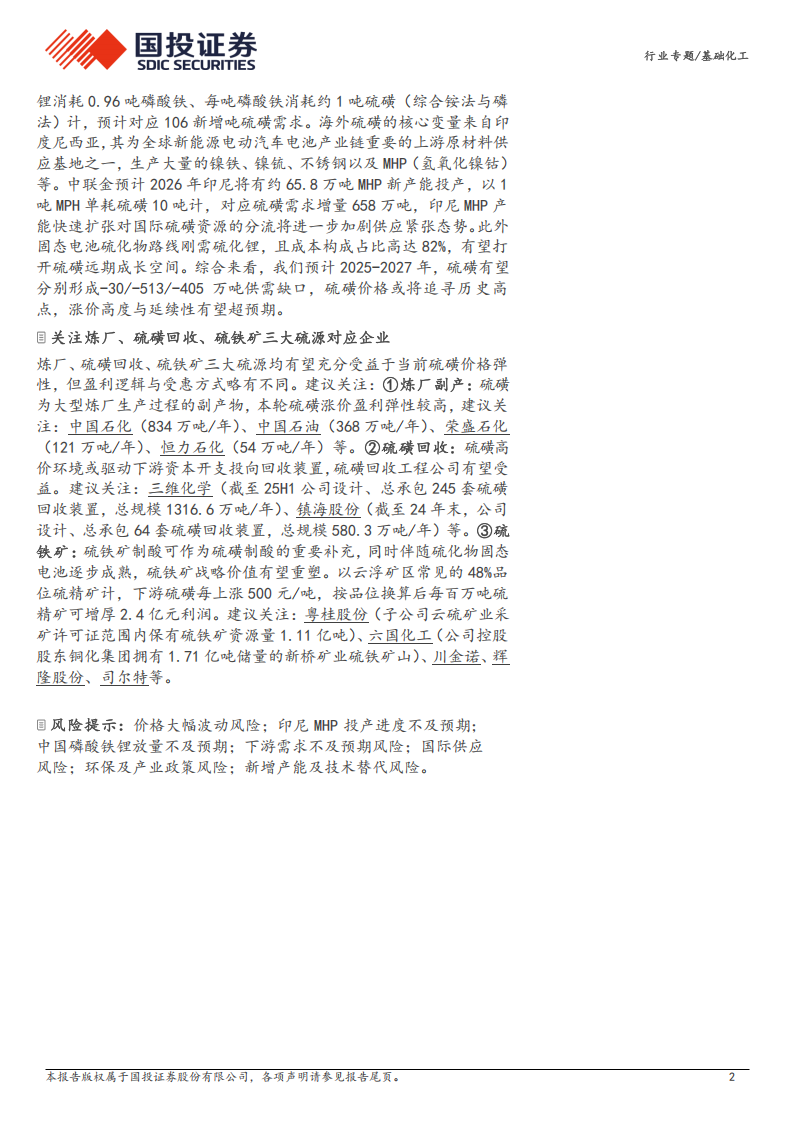 炼厂、硫磺回收、硫铁矿三大硫源均有望充分受益于当前硫磺价格弹性,但盈利逻辑与受惠方式略有不同。建议关注:①炼厂副产:硫磺为大型炼厂生产过程的副产物,本轮硫磺涨价盈利弹性较高,建议关注:中国石化(834万吨/年)、中国石油(368万吨/年)、荣盛石化(121万吨/年)、恒力石化(54万吨/年)等。②硫磺回收:硫磺高价环境或驱动下游资本开支投向回收装置,硫磺回收工程公司有望受益。建议关注:三维化学(截至25H1公司设计、总承包245套硫磺回收装置,总规模1316.6万吨/年)、镇海股份(截至24年末,公司设计、总承包64套硫磺回收装置,总规模580.3万吨/年)等。③硫铁矿:硫铁矿制酸可作为硫磺制酸的重要补充,同时伴随硫化物固态电池逐步成熟,硫铁矿战略价值有望重塑。以云浮矿区常见的48%品位硫精矿计,下游硫磺每上涨500元/吨,按品位换算后每百万吨硫精矿可增厚2.4亿元利润。建议关注:粤桂股份(子公司云硫矿业采矿许可证范围内保有硫铁矿资源量1.11亿吨)、六国化工(公司控股股东铜化集团拥有1.71亿吨储量的新桥矿业硫铁矿山)、川金诺、辉隆股份、司尔特等。