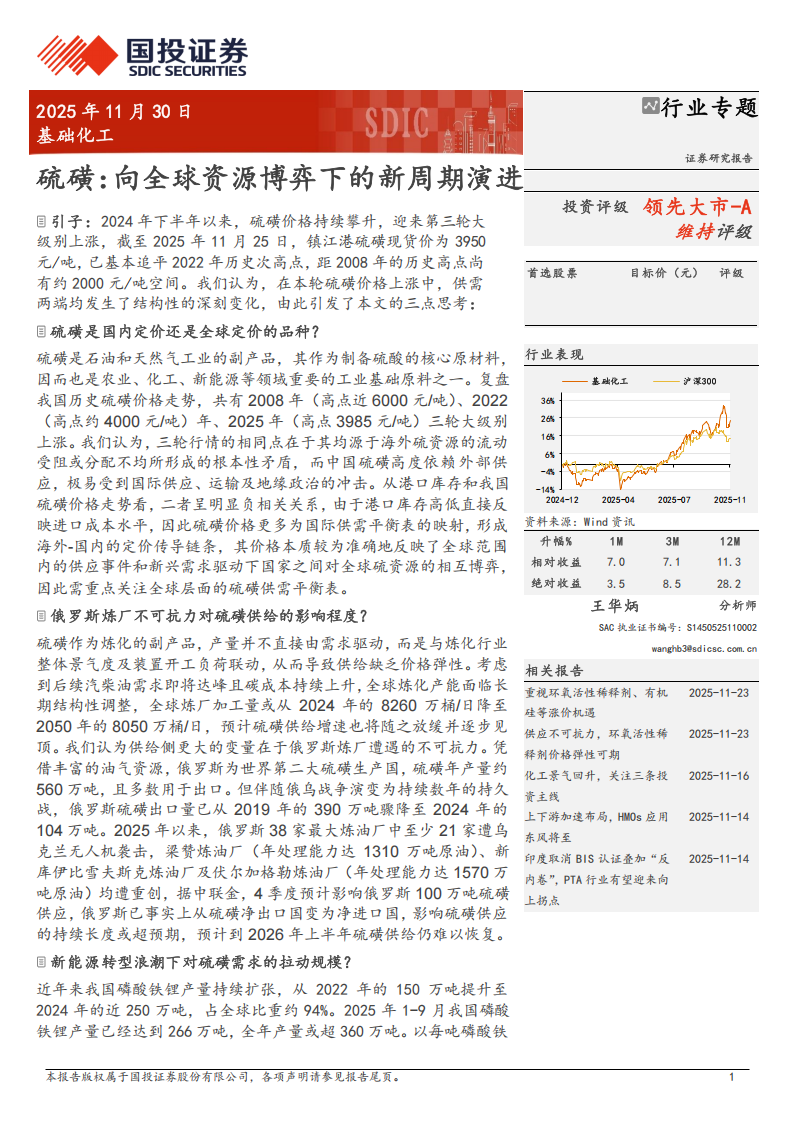目引子:2024年下半年以来,硫磺价格持续攀升,迎来第三轮大级别上涨,截至2025年11月25日,镇江港硫磺现货价为3950元/吨,已基本追平2022年历史次高点,距2008年的历史高点尚有约2000元/吨空间。我们认为,在本轮硫磺价格上涨中,供需两端均发生了结构性的深刻变化,由此引发了本文的三点思考: