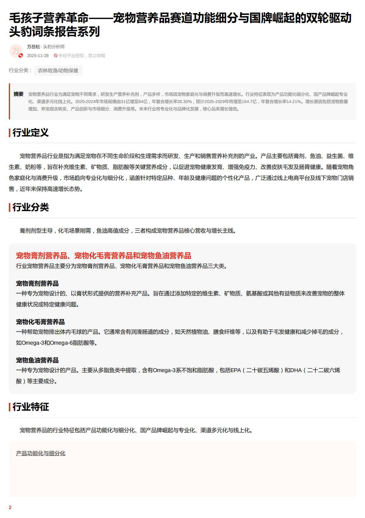 宠物营养品的行业特征包括产品功能化与细分化、国产品牌崛起与专业化、渠道多元化与线上化