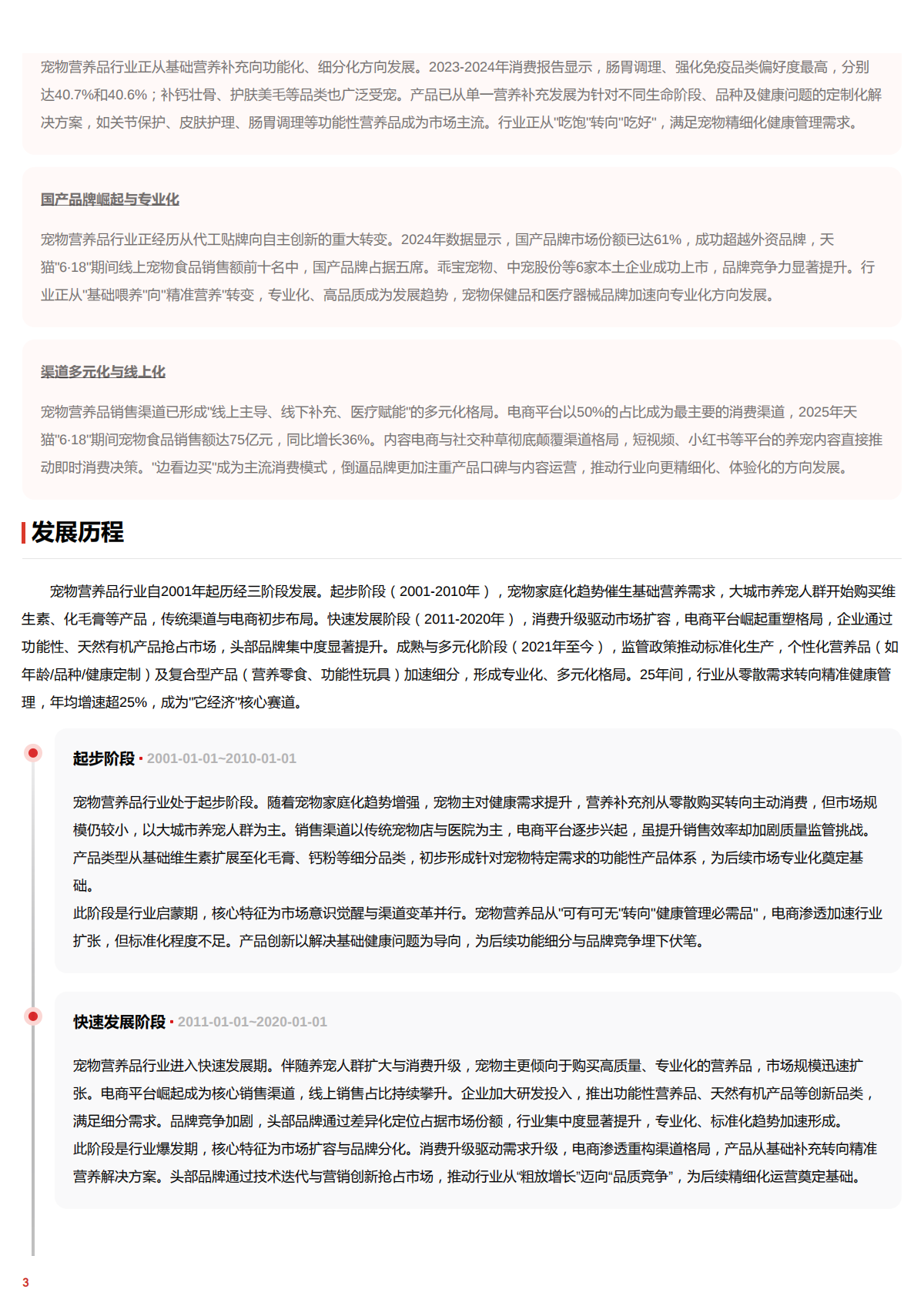 宠物营养品行业自2001年起历经三阶段发展,起步阶段(2001-2010年),宠物家庭化趋势催生基础营养需求,大城市养宠人群开始购买维生素、化毛膏等产品,传统渠道与电商初步布局,快速发展阶段(2011-2020年),消费升级驱动市场扩容,电商平台崛起重塑格局,企业通过功能性、天然有机产品抢占市场,头部品牌集中度显著提升。成熟与多元化阶段(2021年至今),监管政策推动标准化生产,个性化营养品(如年龄/品种健康定制)及复合型产品(营养零食、功能性玩具)加速细分,形成专业化、多元化格局。25年间,行业从零散需求转向精准健康管理,年均增速超25%,成为“它经济“核心赛道。