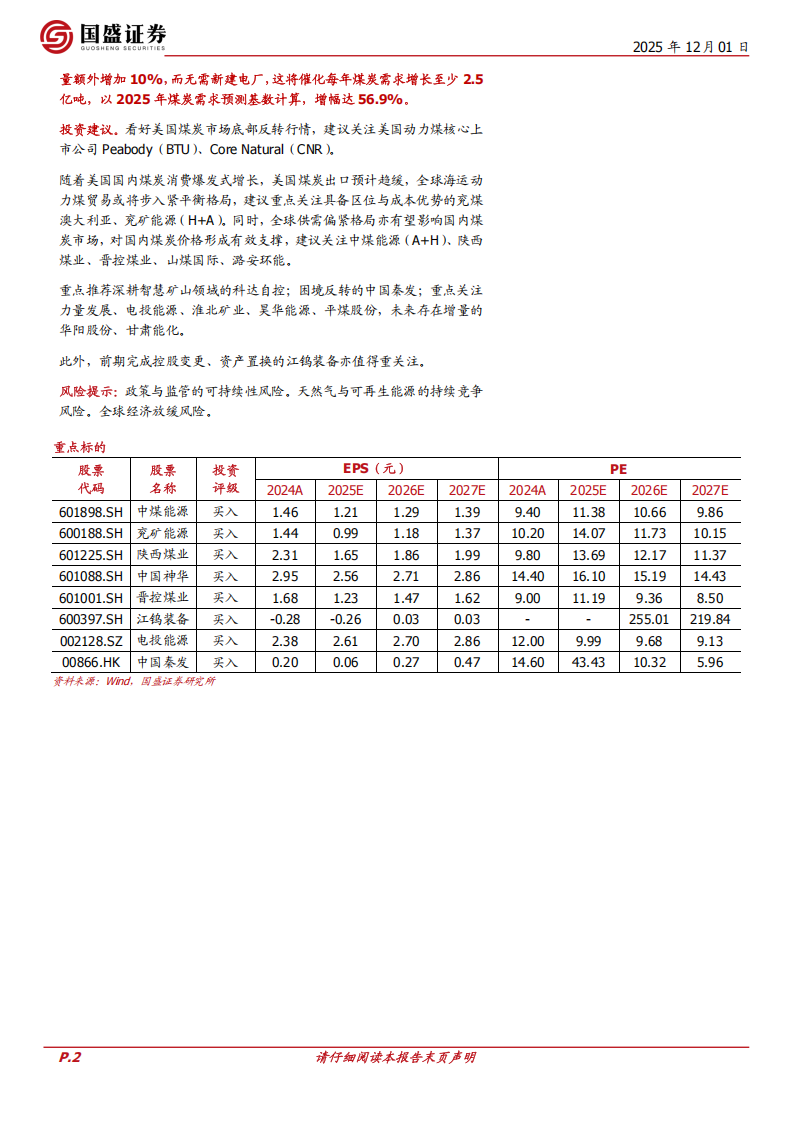 投资建议。看好美国煤炭市场底部反转行情,建议关注美国动力煤核心上市公司Peabody(BTU)、Core Natural(CNR)。