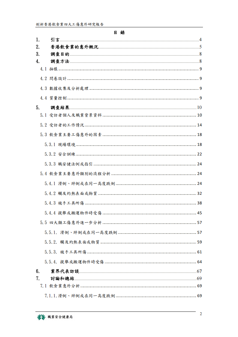 為探封飲食業從業員的職業安全健康状況,職業安全健康局(職安局)早於2000年及2001年分别探封了中式酒樓厨房工作人員和樓面工作人員所面對的職業安全健康問题(職安局,2000;2001b);並隨後更進一步了解整體香港飲食業的管理人員和員工對安全的價值觀、態度、認知、騰任能力及其行為模式(職安局,2001a)。另外,於2002年及2003年,職安局亦展開了對本港受傷催員的職業安全健康状況的探封(職安局,2003),並於2005年作進一步調查,對高危行業如建造業和飲食業的主要工傷意外進行分析(職安局,2006),剖析工傷發生的原因·這些调查大大幫助我們了解受傷催員對職安健的認知和態度以及行業的職安健状況。