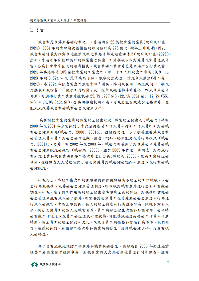 飲食業是本港主要的行業之一,香港约有22萬飲食業從業員(政府统計虞,2024)·2024年的食肆總收益價值的臨時估計為276億元,按年上升0.4%,因此,飲食業的發展對推動本地經濟及旅遊業起着舉足輕重的作用(政府统計虞,2025)。然而,香港每年有数以萬計的職業傷亡個案,工傷事故不但對偏員及家属造成傷害,亦為社會带來巨大的經濟损失·飲食業的工業意外更是本港所有行業之首,2024年共録得3,105宗飲食業的工業意外,每一千工人計的意外率為13.9,比2023年的3,524宗及15.7有所下降,数字仍然高企,情況令人關注(劳工虞,2024)。在2024年飲食業意外類别中以「滑倒、绊倒或在同一高度跌倒『觸及灼熱表面或物質」「被手工具所傷」及「提舉或搬逻物件時受傷」四大原因受傷為主,分别佔行業工業意外總数的25.7%(797宗)、22.4%(694宗)·17.7%(551宗)和14.0%(434宗),合共约佔總数的八成。可见若能有效減少這些意外,便能大大改善飲食業的職業安全及健康水平。