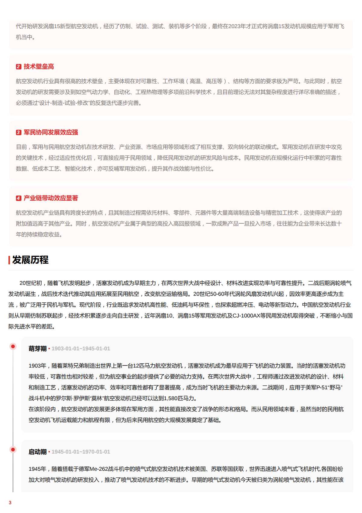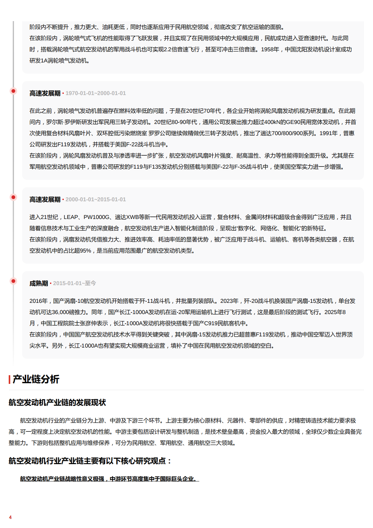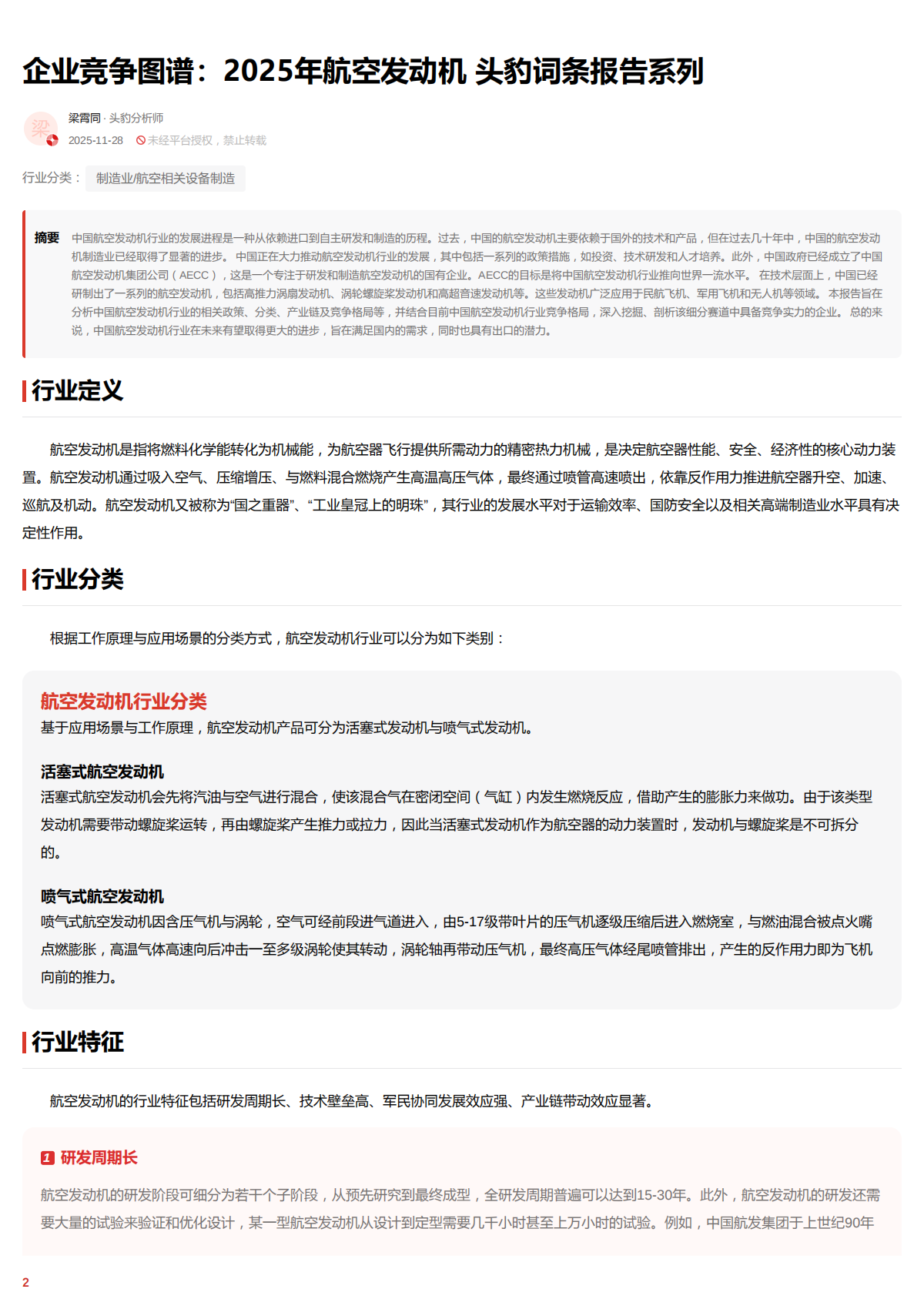 摘要 中国航空发动机行业的发展进程是一种从禁蝗进口到自主研发和年边的历程,过去,中国的部空发动机主要禁赖于图外的技术和产品,但在过去几十年中,中国的盖空发动机转业已经取得了显著的进步,中国正在大力签助航空发动机行业的发展,其中包括一系列的政策措施,如投资、技术研发和人才培养,此外,中国政府已经成立了中国航空发动机集团公司(AECC),这是一个专注于研发和制造航空发动机的匡有企业。AECC的目标是将中医航空发动机行业签向世界一流水平。在技术屈而上,中国已经研出了一系列的盖空发动机,包括商桩力派磨发动机、泥蛇蠕旋桨发动机和湾趣音速发动机等,这些发动机广泛应用于民航飞机、军用飞机和无人机等领域。本报告旨在分析中国航空发动机行业的相关政策、分类、产业链及竞争格尼等,并站合目前中压航空发动机行业竞争格局,深入挖腿、部析该细分赛道中具备宽争实力的企业。总的来说,中国航空发动机行业在未来有望联得更大的进步,旨在满足国内的需求,同时也具有出口的潜力。