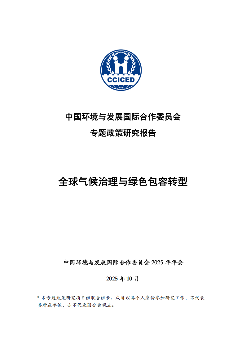 “全球气候治理与绿色包容转型”专题政策研究项目为中国环境与发展国际合作委员会(以下简称国合会)“全球环境治理创新”课题2024—2025年下设专题之一。本年度专题研究立足新的国际形势,旨在重新定位中国在全球气候治理中的角色,并兼顾国际国内多重发展需求,探索中国中长期能源转型和绿色低碳产业发展路径,力求为中国实现全面绿色转型提供路径和政策参考,为“十五五”规划时期的气候政策制定提供技术支持,为中国参与应对气候变化国际合作和《联合国气候变化框架公约》第三十次缔约方大会(COP30)相关事务提供决策支持。