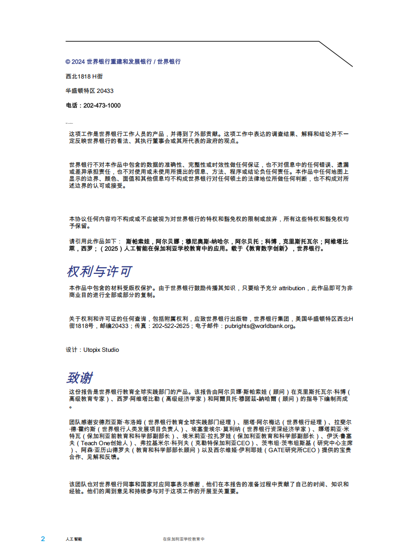团队感谢安德烈亚斯·布洛姆(世界银行教育全球实践部门经理)、丽塔·阿尔梅达(世界银行经理)、拉斐尔德·霍约斯(世界银行人类发展项目负责人)、埃塞奎埃尔·莫利纳(世界银行资深经济学家)、娜塔莉亚·米特瓦(保加利亚前教育和科学部副部长)、埃米莉亚·拉扎罗娃(保加利亚教育和科学部副部长)、伊沃·鲁塞夫(Teach One创始人)、弗拉基米尔·科列夫(克勒特保加利亚CEO)、茨韦坦·茨韦坦斯基(研究中心主席)、阿森·亚历山德罗夫(教育和科学部部长顾问)以及西尔维娅·伊利耶娃(GATE研究所CEO)提供的宝贵合作、见解和反馈。