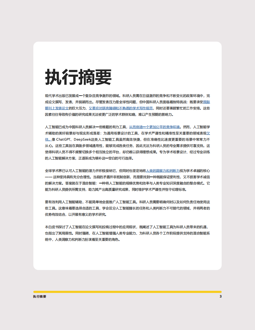 本白皮书探讨了人工智能在论文撰写和投稿过程中的应用现状,既阐述了人工智能工具为科研人员带来的机遇,也指出了其局限性。同时强调,在人工智能增强人类专业能力、为科研人员各个工作阶段提供支持的混合智能系统中,人类洞察力和判断力扮演着至关重要的角色。