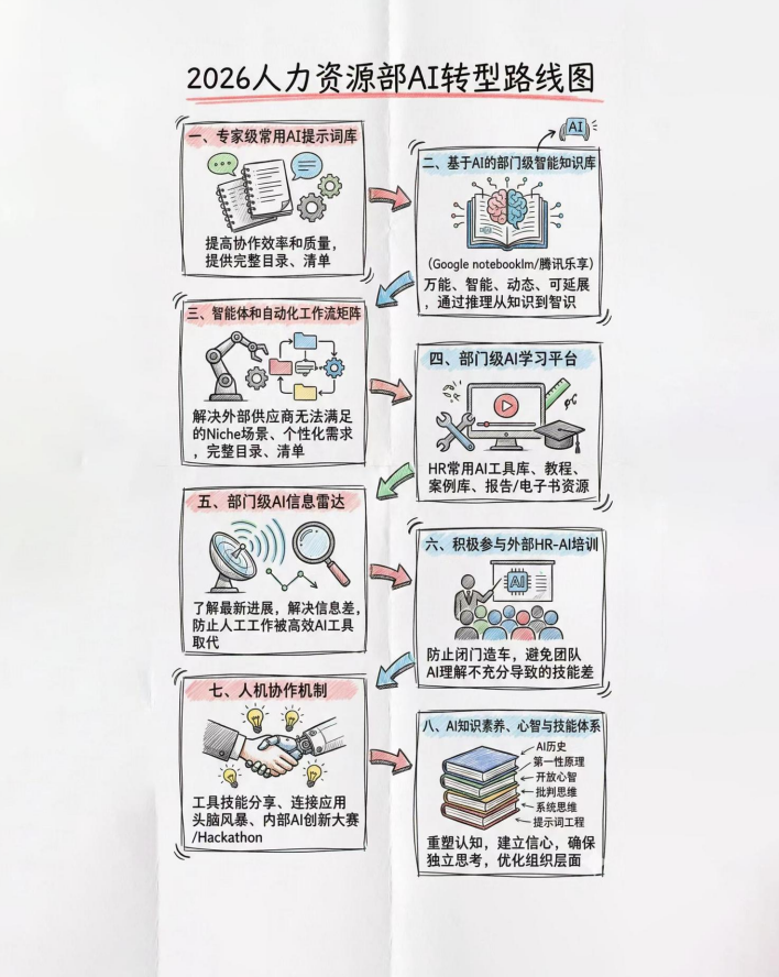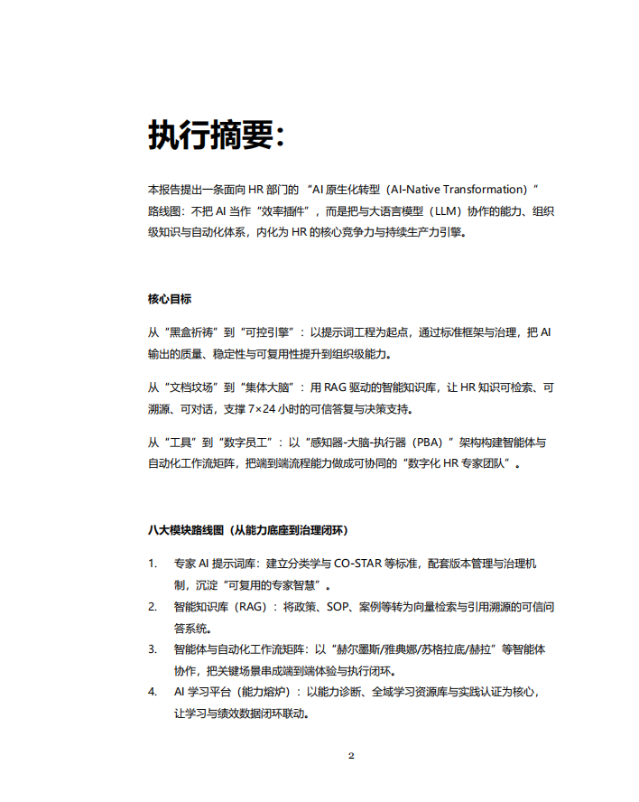 本报告提出一条面向HR部门的“Al原生化转型(Al-Native Transformation)”路线图:不把AI当作“效率插件”,而是把与大语言模型(LLM)协作的能力、组织级知识与自动化体系,内化为HR的核心竞争力与持续生产力引擎。