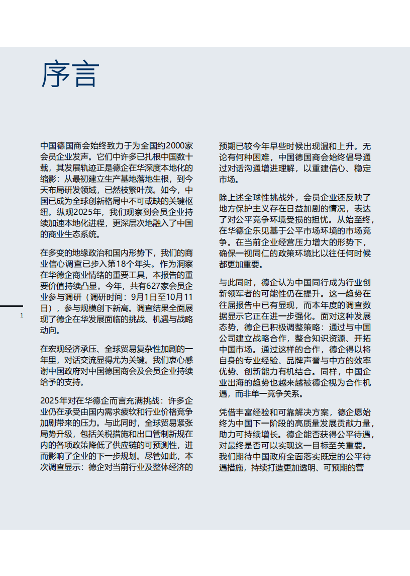 会员企业发声。它们中许多已扎根中国数十载,其发展轨迹正是德企在华深度本地化的缩影:从最初建立生产基地落地生根,到今天布局研发领域,已然枝繁叶茂。如今,中国已成为全球创新格局中不可或缺的关键枢纽。纵观2025年,我们观察到会员企业持续加速本地化进程,更深层次地融入了中国的商业生态系统。在多变的地缘政治和国内形势下,我们的商业信心调查已步入第18个年头。作为洞察在华德企商业情绪的重要工具,本报告的重要价值持续凸显。今年,共有627家会员企业参与调研(调研时间:9月1日至10月11日),参与规模创下新高。调查结果全面展现了德企在华发展面临的挑战、机遇与战略动向。在宏观经济承压、全球贸易复杂性加剧的一年里,对话交流显得尤为关键。我们衷心感谢中国政府对中国德国商会及会员企业持续给予的支持。2025年对在华德企而言充满挑战:许多企业仍在承受由国内需求疲软和行业价格竞争加剧带来的压力。与此同时,全球贸易紧张局势升级,包括关税措施和出口管制新规在内的各项政策降低了供应链的可预测性,进而影响了企业的下一步规划。尽管如此,本次调查显示:德企对当前行业及整体经济的预期已较今年早些时候出现温和上升。无论有何种困难,中国德国商会始终倡导通过对话沟通增进理解,以重建信心、稳定市场。除上述全球性挑战外,会员企业还反映了地方保护主义存在日益加剧的情况,表达了对公平竞争环境受损的担忧。从始至终,在华德企乐见基于公平市场环境的市场竞争。在当前企业经营压力增大的形势下,确保一视同仁的政策环境比以往任何时候都更加重要。与此同时,德企认为中国同行成为行业创新领军者的可能性仍在提升。这一趋势在往届报告中已有显现,而本年度的调查数据显示它正在进一步强化。面对这种发展态势,德企已积极调整策略:通过与中国公司建立战略合作,整合知识资源、开拓中国市场。通过这样的合作,德企得以将自身的专业经验、品牌声誉与中方的效率优势、创新能力有机结合。同样,中国企业出海的趋势也越来越被德企视为合作机遇,而非单一竞争关系。凭借丰富经验和可靠解决方案,德企愿始终为中国下一阶段的高质量发展贡献力量,助力可持续增长。德企能否获得公平待遇,对最终是否可以实现这一目标至关重要。我们期待中国政府全面落实既定的公平待遇措施,持续打造更加透明、可预期的营商环境。本年度报告提出了具体建议,以期增强投资者信心,为所有市场参与者创造长期价值。