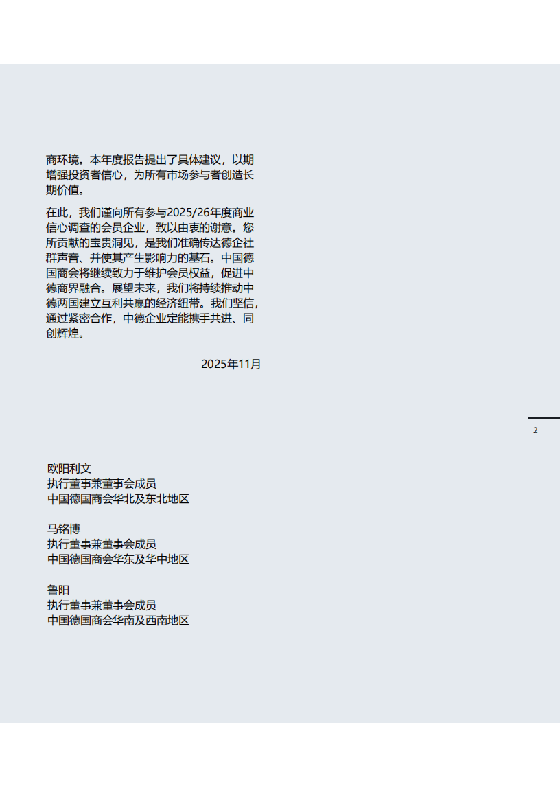 在此,我们谨向所有参与2025/26年度商业信心调查的会员企业,致以由衷的谢意。您所贡献的宝贵洞见,是我们准确传达德企社群声音、并使其产生影响力的基石。中国德国商会将继续致力于维护会员权益,促进中德商界融合。展望未来,我们将持续推动中德两国建立互利共赢的经济纽带。我们坚信,通过紧密合作,中德企业定能携手共进、同创辉煌。