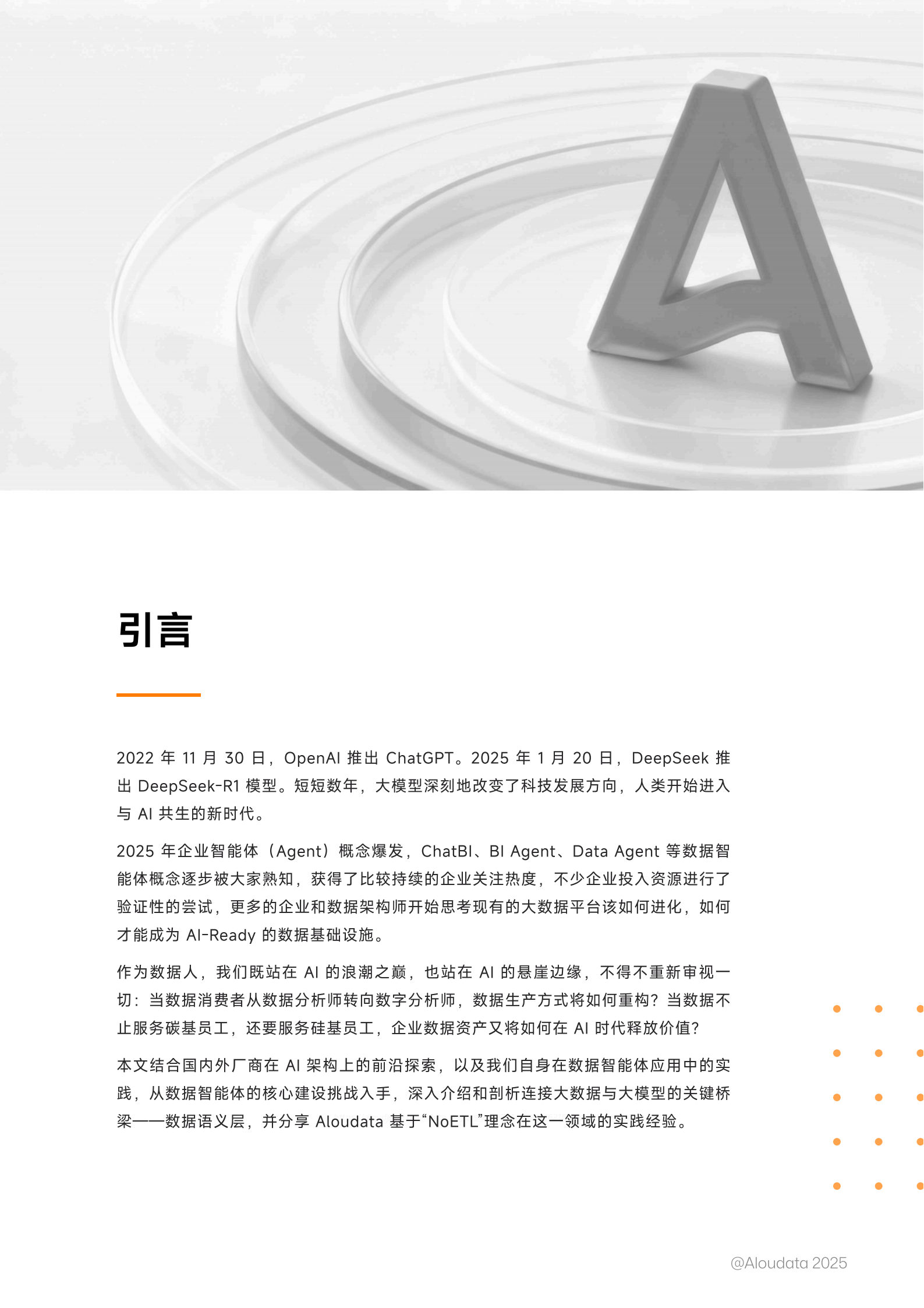 本文结合国内外厂商在AI架构上的前沿探索,以及我们自身在数据能算体应用中的实践,从数据智能体的核心建设挑战入手,深入介绍和剖析连接大数据与大模型的 关键桥梁——数据语义层,并分享Aoudata基于NoEVT理念在这一领域的实践经验。