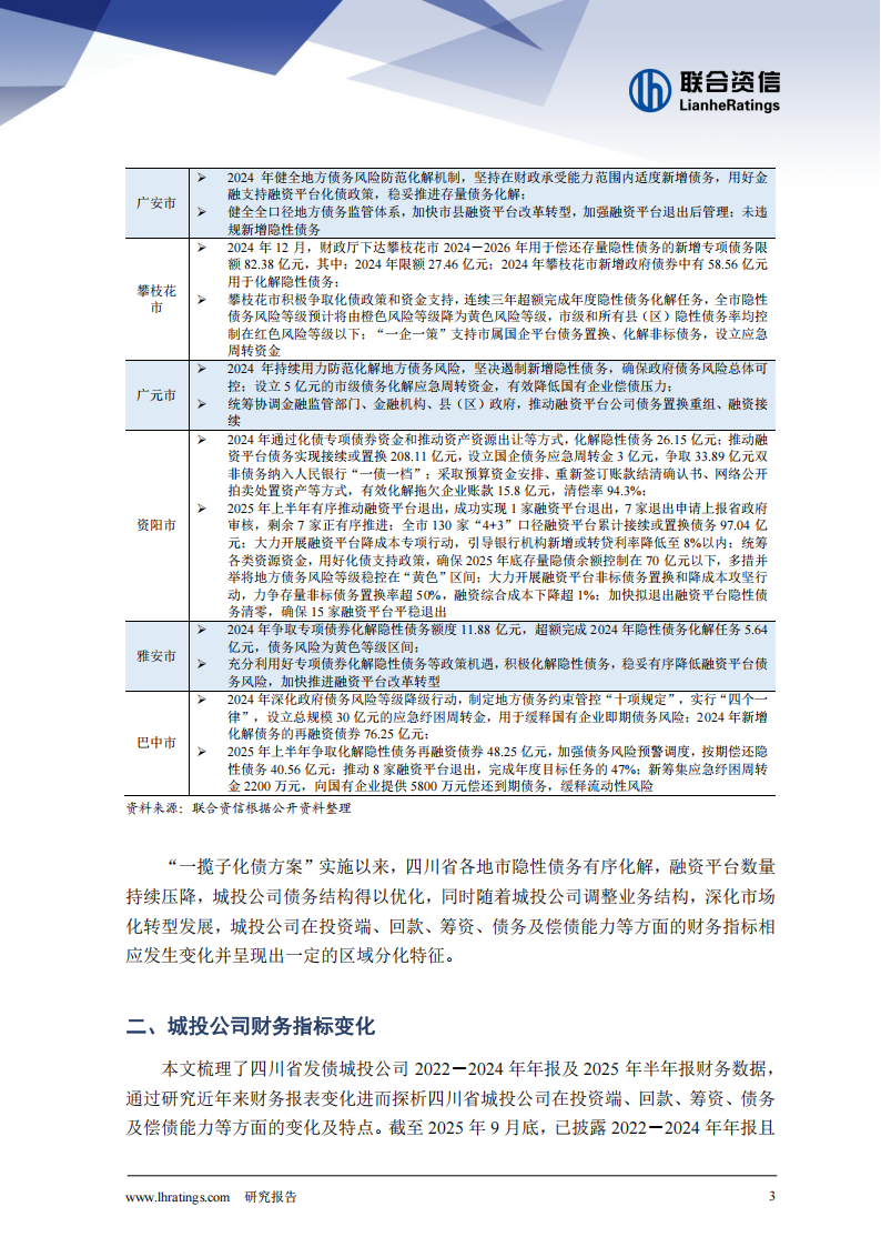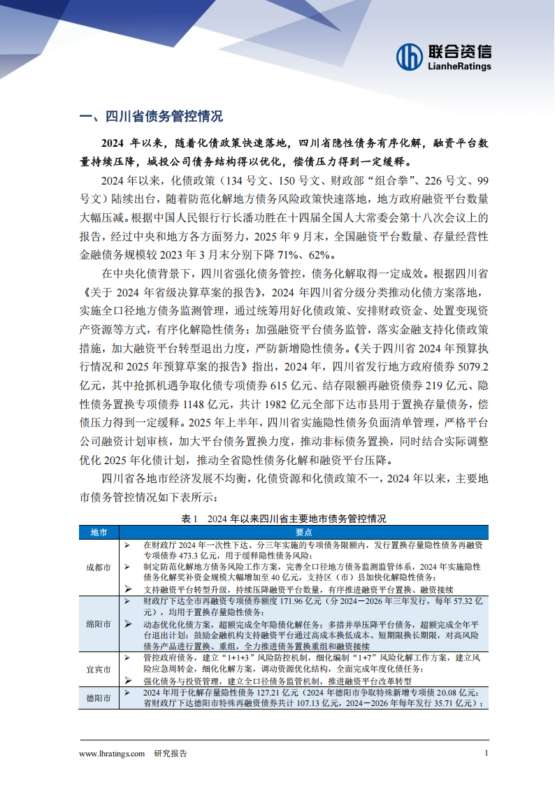 2024年以来,随着化债政策快速落地,四川省隐性债务有序化解,融资平台数量持续压降,城投公司债务结构得以优化,偿债压力得到一定缓释。