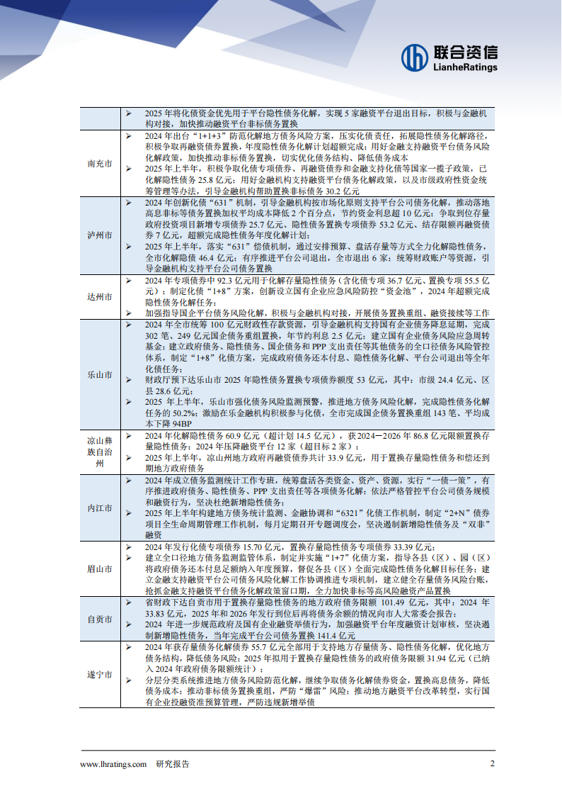 在中央化债背景下,四川省强化债务管控,债务化解取得一定成效。根据四川省《关于2024年省级决算草案的报告》,2024年四川省分级分类推动化债方案落地,实施全口径地方债务监测管理,通过统筹用好化债政策、安排财政资金、处置变现资产资源等方式,有序化解隐性债务;加强融资平台债务监管,落实金融支持化债政策措施,加大融资平台转型退出力度,严防新增隐性债务。《关于四川省2024年预算执行情况和2025年预算草案的报告》指出,2024年,四川省发行地方政府债券5079.2亿元,其中抢抓机遇争取化债专项债券615亿元、结存限额再融资债券219亿元、隐性债务置换专项债券1148亿元,共计1982亿元全部下达市县用于置换存量债务,偿债压力得到一定缓释。2025年上半年,四川省实施隐性债务负面清单管理,严格平台公司融资计划审核,加大平台债务置换力度,推动非标债务置换,同时结合实际调整优化2025年化债计划,推动全省隐性债务化解和融资平台压降。