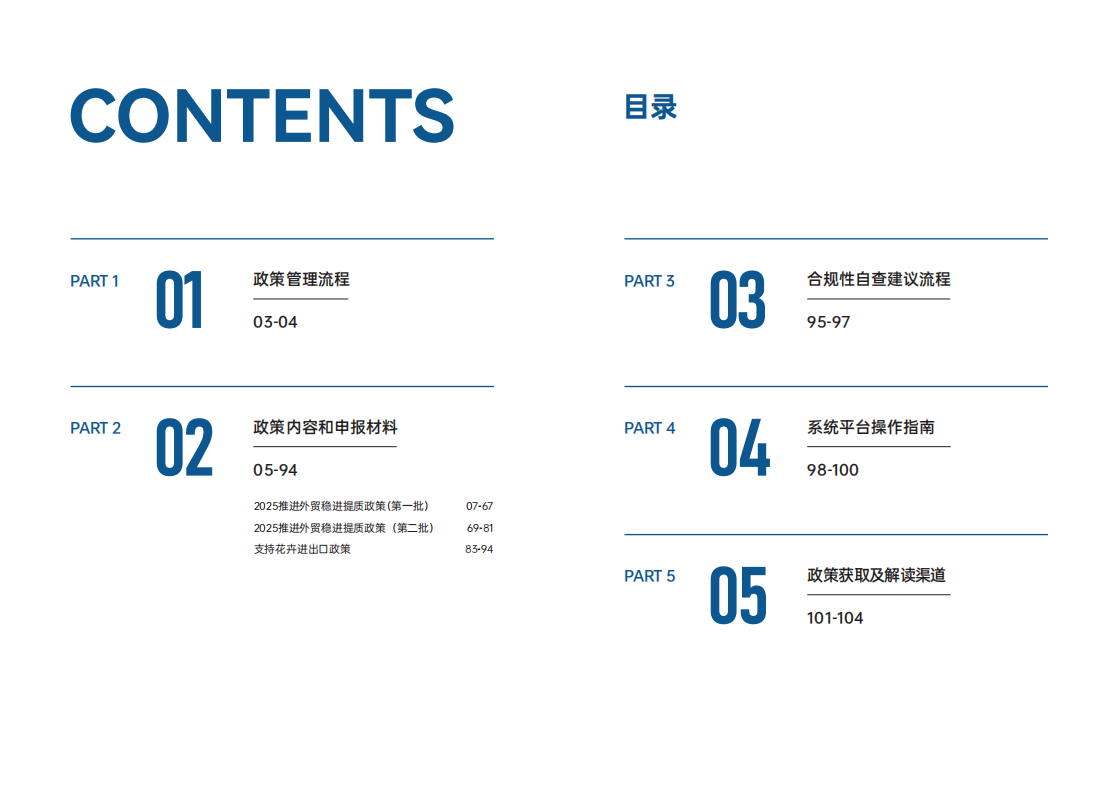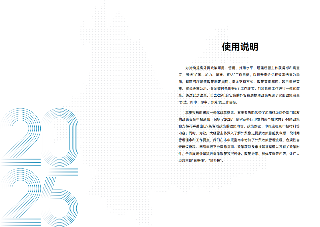 本申报指南隶属一体化改革成果,其主要功能代替了原由各级商务部门印发的政策资金申报通知,包括了2025年度省商务厅印发的两个批次共计44条政策和支持花卉进出口9条专项政策的政策内容、政策解读、申报流程和申报材料等内容。同时,为让广大经营主体深入了解外贸稳进提质政策目前及今后一段时间管理理念和工作要点,我们在本申报指南中增加了外贸政策管理流程、合规性自查建议流程、网络申报平台操作指南、政策获取及申报解答渠道以及有关政策附件,全面展示外贸稳进提质政策顶层设计、政策导向、具体实操等内容,让广大经营主体”看得懂”、易办理”。
