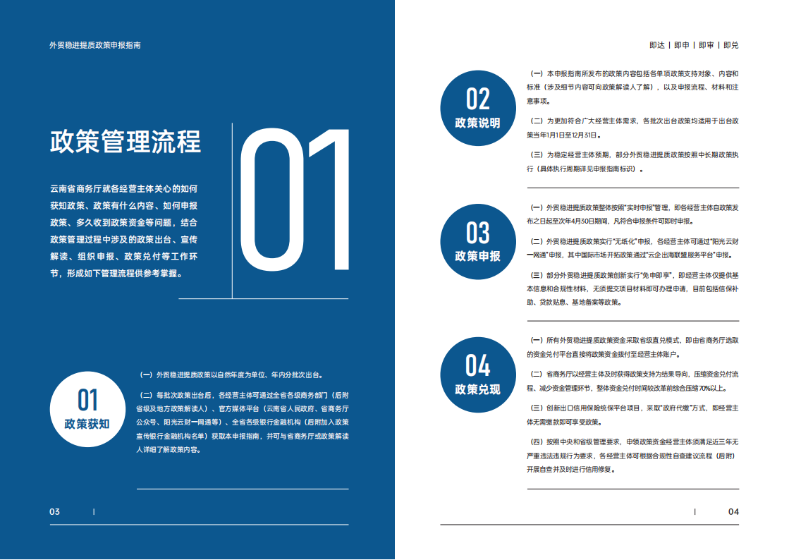 (一)外贸稳进提质政策整体按照实时申报管理,即咯经营主体自政策发(二)外贸稳进提质政策实行无纸化申报,各经营主体可通过”阳光云财(三)部分外贸稳进提质政策创新实行”免申即享”,即经营主体仅提供基布之日起至次年4月30日期搁,凡符合申报条件可即时申报,一网道申报,其中国际市场开拓政策通过云企出海联盟服务平台申报,本信息和合规性材料,无颁提交项目材料即可办理申请,目前包捂信保补助,货款贴息、基地备案等政策,