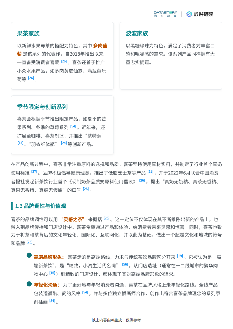 喜茶的市场定位为高端茶饮品牌[19],目标消费群体主要是年轻的白领和学生群体[19]。通过提供健康的产品和融合茶禅的品牌体验,喜茶满足了年轻人对社交、身份和自我认知需求[15]。喜茶坚持以“真茶、真奶、真果、真糖”为原料[16],并承诺全线产品符合“0奶精、0香精、0果葡糖浆、0植脂末”的标准[16]。其产品线丰富多样,包括首创的芝士茶系列[211、果茶家族(如多肉葡萄[13])、波波家族,以及季节限定、咖啡饮品、喜茶制冰等[54]。喜茶还不断进行产品创新,例如推出“茶特调”系列[14],以满足消费者不断变化的需求。