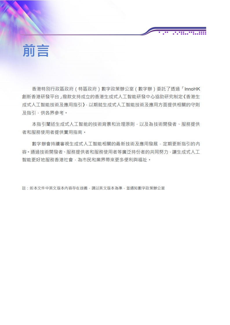 受特區政府的委託,HKGAI蔘考業界專家意見以及國際最佳實踐經驗,編制《香港生成式人工智能技術及應用指引》(指引)。指引旨在推動香港特别行政區内的相關持份者,在 格遵循科技倫理、道德準則以及法律規範的基礎上,安全且負責任地開展涉及生成式人工智能的相關業務及活動·同時,為各持份者提供切實可行的指引,有效協助應對生成式人工智能技術引發的安全問题及社會風险。