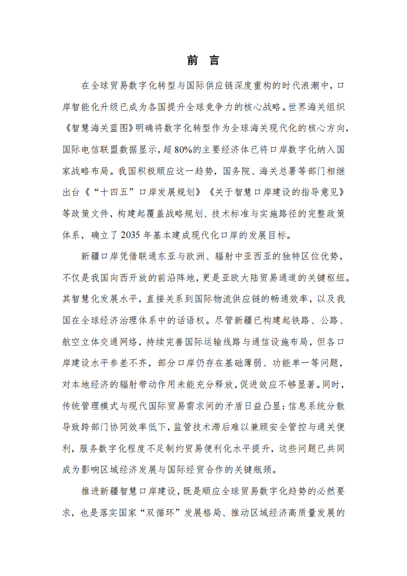 本白皮书结合新疆区域特色,系统梳理智慧口岸建设的时代背景、现实需求、技术路径与实践成果。通过严谨的政策分析与详实的案例研究,旨在为构建现代化口岸治理体系提供参考,助力新疆在全球经济治理中发挥更大作用,推动亚欧大陆经贸合作迈向更高水平。