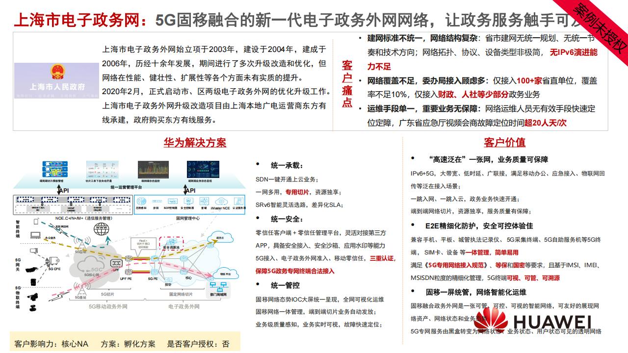 2020年2月,正式启动市、区两级电子政务外网的优化升级工作。上海市电子政务外网升级改造项目由上海本地广电运营商东方有线承建,政府购买东方有线服务。《湖北省电子政务外网升级整合项目初步设计评审报告》中要求政务外网平台升级整合遵循统一的标准规范,网、云、安基础设施及四项公共服务能力支撑数字政府应用,通过三个监管系统实现全省政务外网基础设施的可视、可督、可评,构建湖北省政务外网省、市、县、乡、村五级架构。联合华为开展电子政务外网升级,推动IPV6规模部署,优化电子政务外网服务能力。