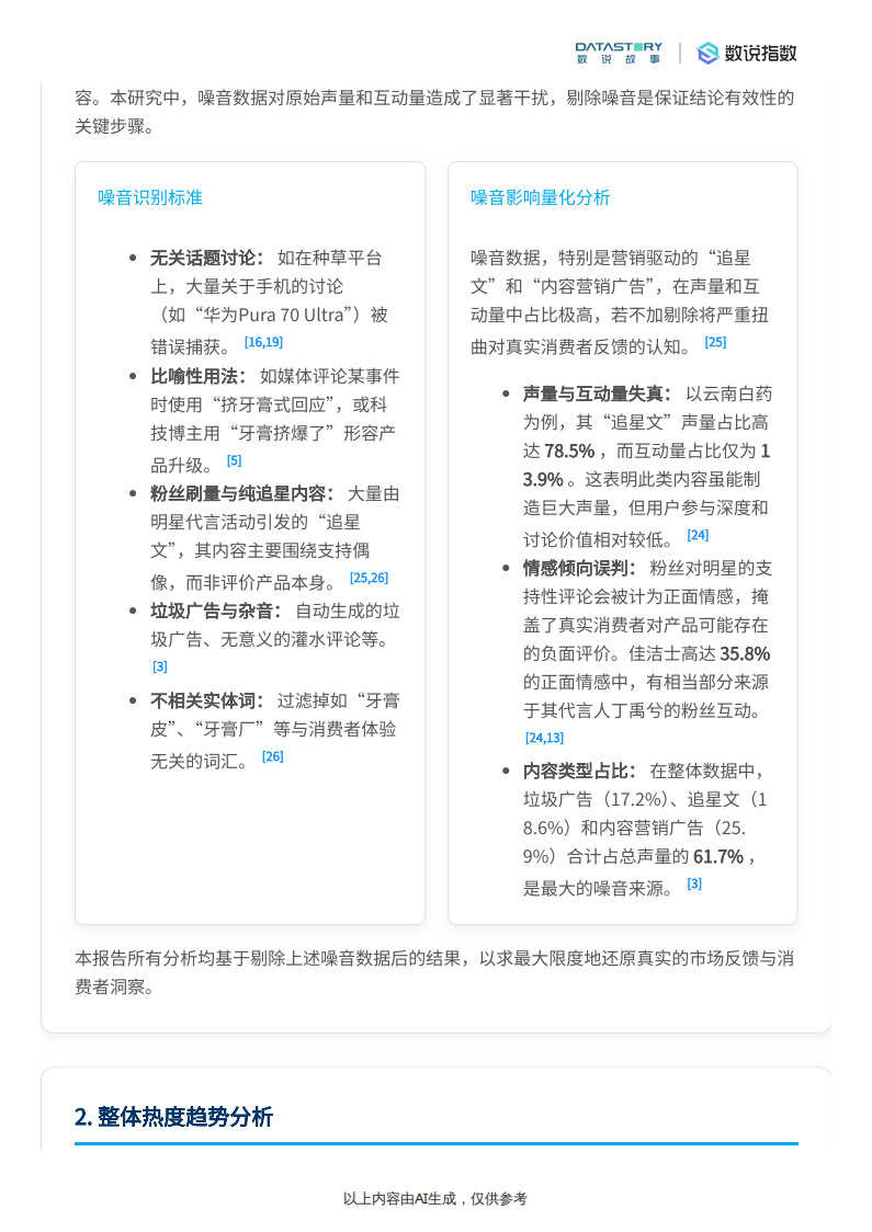为确保本报告分析的准确性与客观性,我们对原始社交媒体数据进行了严格的清洗与噪音剔除。噪音数据主要指与牙膏产品本身讨论无关,但因包含“牙膏”关键词而被错误捕获的内容。本研究中,噪音数据对原始声量和互动量造成了显著干扰,剔除噪音是保证结论有效性的
