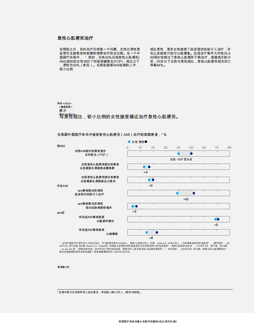除了错失的财务潜力之外,未能提供及时的预防性护理会增加女性的疾病风险,并可能导致后期更昂贵、更复杂的干预措施。事实上,与其他各种情况相比,女性获得推荐治疗完整方案的几率通常低于男性,这通常是由于错过了关键的预防性护理机会(参见小资料“急性心肌梗死治疗”)。