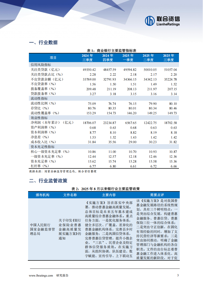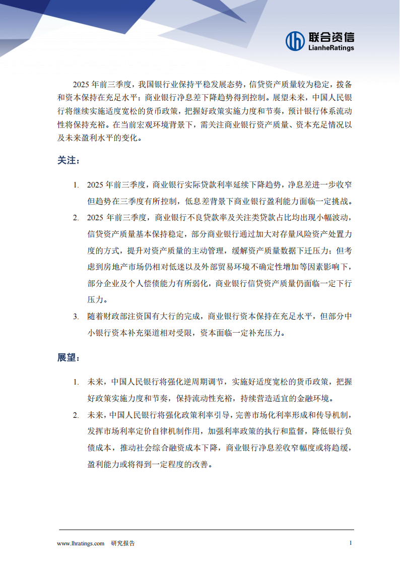2025年前三季度,我国银行业保持平稳发展态势,信贷资产质量较为稳定,拨备和资本保持在充足水平;商业银行净息差下降趋势得到控制。展望未来,中国人民银行将继续实施适度宽松的货币政策,把握好政策实施力度和节奏,预计银行体系流动性将保持充裕。在当前宏观环境背景下,需关注商业银行资产质量、资本充足情况以及未来盈利水平的变化。