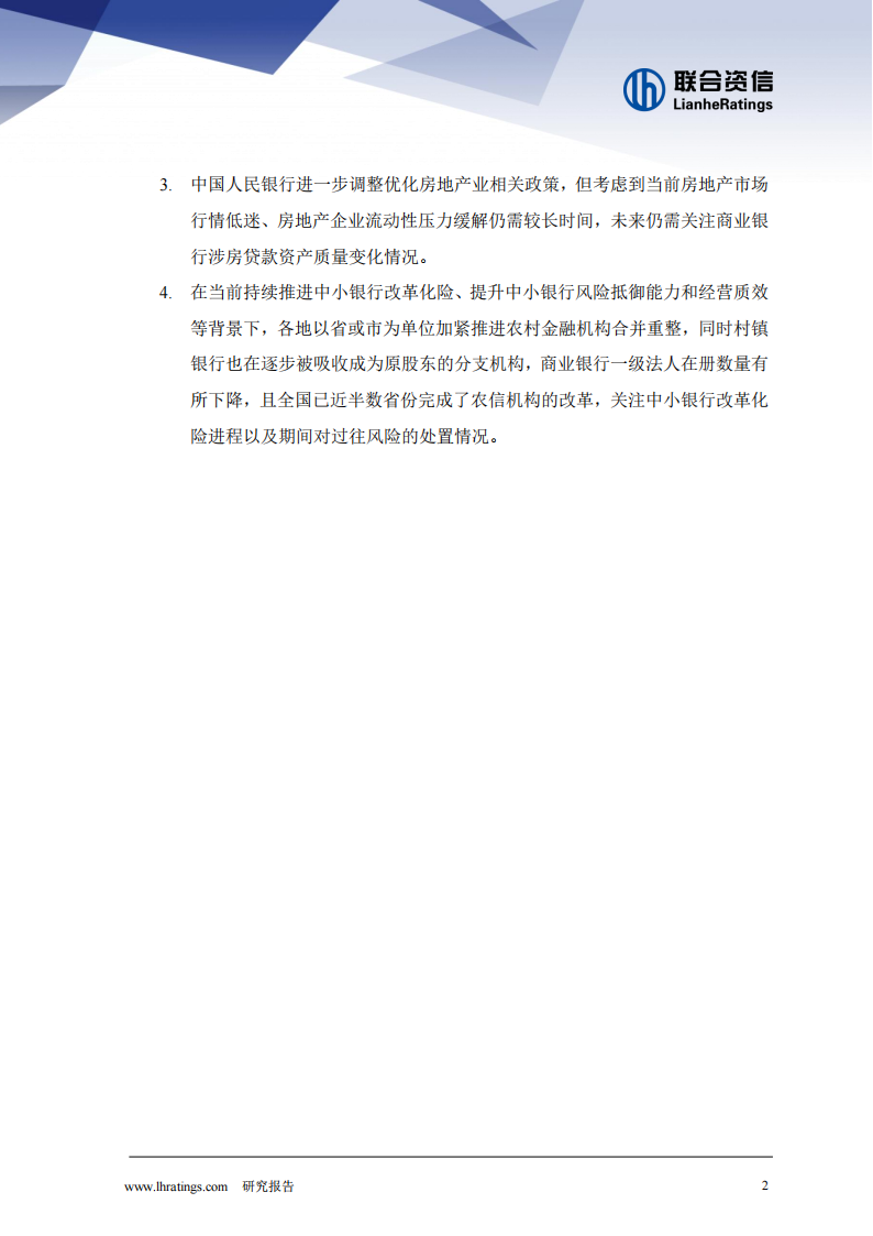 2.未来,中国人民银行将强化政策利率引导,完善市场化利率形成和传导机制,发挥市场利率定价自律机制作用,加强利率政策的执行和监督,降低银行负债成本,推动社会综合融资成本下降,商业银行净息差收窄幅度或将趋缓,盈利能力或将得到一定程度的改善。中国人民银行进一步调整优化房地产业相关政策,但考虑到当前房地产市场行情低迷、房地产企业流动性压力缓解仍需较长时间,未来仍需关注商业银行涉房贷款资产质量变化情况。