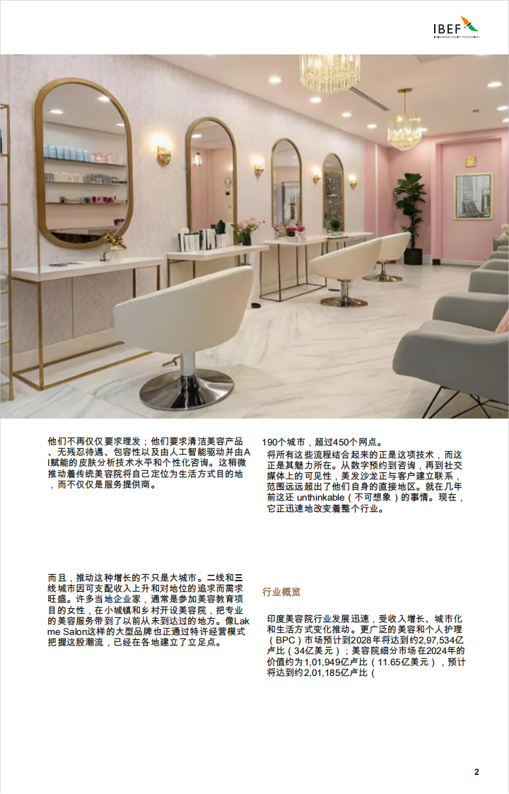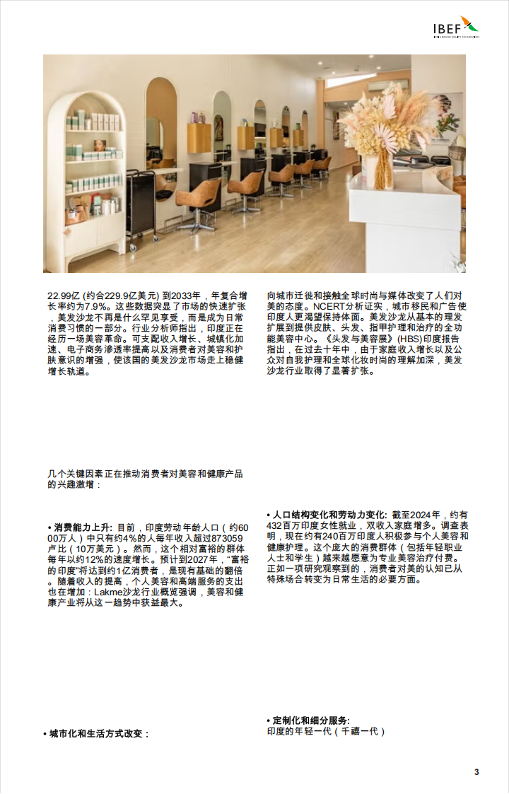 而且,推动这种增长的不只是大城市。二线和三线城市因可支配收入上升和对地位的追求而需求旺盛。许多当地企业家,通常是参加美容教育项目的女性,在小城镇和乡村开设美容院,把专业的美容服务带到了以前从未到达过的地方。像Lakme Salon这样的大型品牌也正通过特许经营模式把握这股潮流,已经在各地建立了立足点。22.99亿(约合229.9亿美元)到2033年,年复合增长率约为7.9%。这些数据突显了市场的快速扩张,美发沙龙不再是什么罕见享受,而是成为日常消费习惯的一部分。行业分析师指出,印度正在经历一场美容革命。可支配收入增长、城镇化加速、电子商务渗透率提高以及消费者对美容和护肤意识的增强,使该国的美发沙龙市场走上稳健增长轨道。向城市迁徙和接触全球时尚与媒体改变了人们对美的态度。NCERT分析证实,城市移民和广告使印度人更渴望保持体面。美发沙龙从基本的理发扩展到提供皮肤、头发、指甲护理和治疗的全功能美容中心。《头发与美容展》(HBS)印度报告指出,在过去十年中,由于家庭收入增长以及公众对自我护理和全球化妆时尚的理解加深,美发沙龙行业取得了显著扩张。