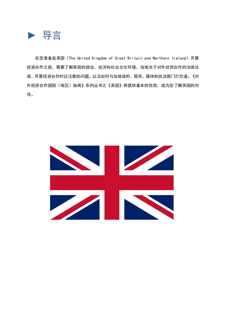 在您准备赴英国(TheUnitedKingdomofGreatBritainandNorthernIreland)开展投资合作之前,需要了解英国的政治、经济和社会文化环境、当地关于对外经贸合作的法律法规、开展投资合作时应注意的问题,以及如何与当地政府、居民、媒体和执法部门打交道。《对外投资合作国别(地区)指南》系列丛书之《英国》将提供基本的信息,成为您了解英国的向导。