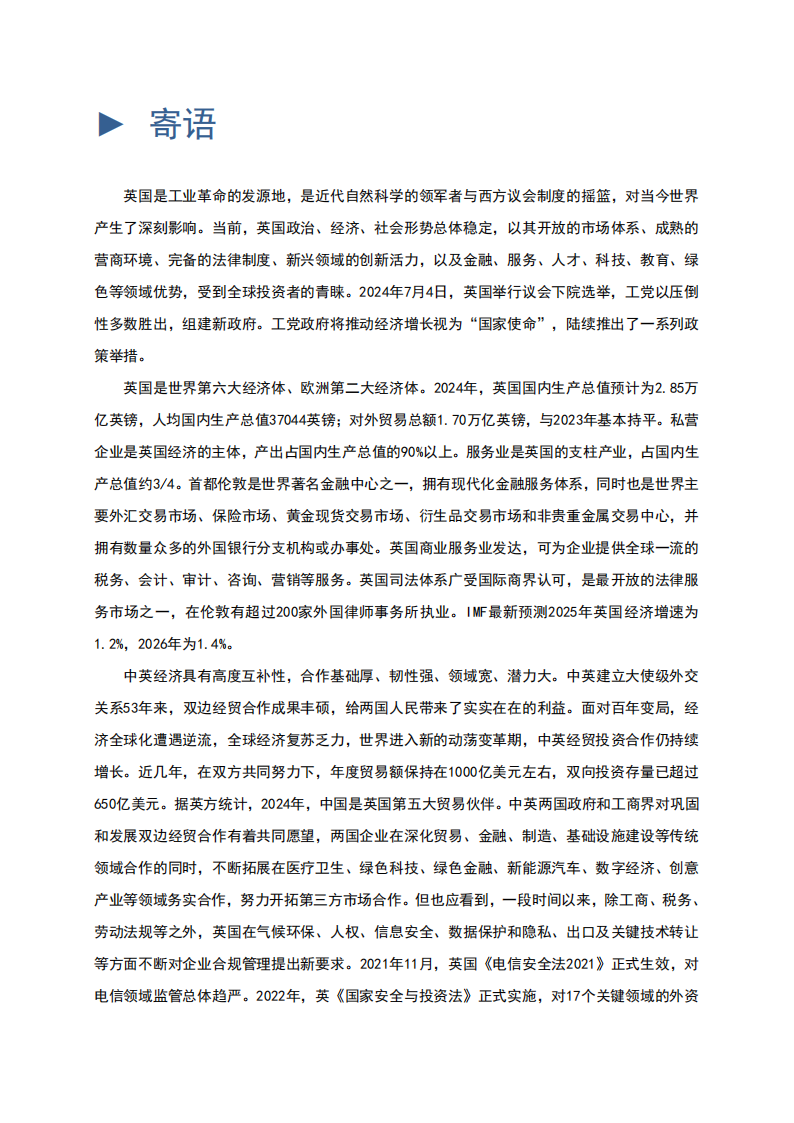 英国是工业革命的发源地,是近代自然科学的领军者与西方议会制度的摇篮,对当今世界产生了深刻影响。当前,英国政治、经济、社会形势总体稳定,以其开放的市场体系、成熟的营商环境、完备的法律制度、新兴领域的创新活力,以及金融、服务、人才、科技、教育、绿色等领域优势,受到全球投资者的青睐。2024年7月4日,英国举行议会下院选举,工党以压倒性多数胜出,组建新政府。工党政府将推动经济增长视为“国家使命”,陆续推出了一系列政策举措。