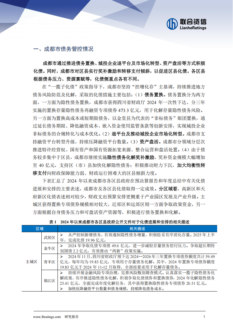 在“一揽子化债”政策指导下,成都市坚持“控增化存”主基调,持续推进地方债务风险防范及化解,采取的化债措施主要包括:(1)债务置换。债务置换分为两方面,一方面为隐性债务置换,成都市获得四川省财政厅2024年一次性下达、分三年实施的置换存量隐性债务再融资专项债券473.3亿元,用于化解存量隐性债务风险。另一方面为置换高成本或短期限债务,以金堂县为代表的“非标债务”银团置换,通过延长债务期限、降低融资成本、嵌入资金使用监管条款等创新安排,实现城投企业非标债务的合规转化与成本优化。(2)退平台及推动城投企业市场化转型。成都市支持融资平台转型升级,持续压降融资平台数量。(3)资产盘活。成都市分领域分层次推进特许经营权、国有资产和国有资源拓宽来源、整合运营和盘活处置。(4)由于债务较多集中于区县,成都市继续实施隐性债务化解奖补激励,奖补资金规模大幅增加至40亿元,支持区(市)县加快化解隐性债务;积极推动财力下沉,加大均衡性转移支付向财政保障能力弱、财政运行困难大的区县倾斜力度。