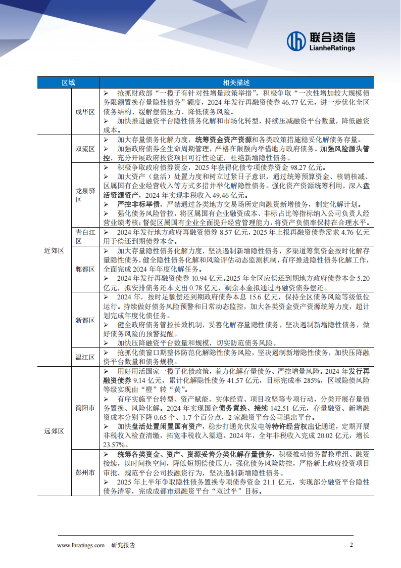 抢抓财政部“一揽子有针对性增量政策举措”,积极争取“一次性增加较大规模债务限额置换存量隐性债务”额度,2024年发行再融资债券46.77亿元,进一步优化全区债务结构、缓解偿债压力、降低债务风险。加快推进融资平台隐性债务化解和市场化转型,持续压减融资平台数量,降低融资成本。▶加大存量债务化解力度,统筹资金资产资源和各类政策措施稳妥化解债务存量。加强政府债券全生命周期管理,严格在限额内举借地方政府债务。加强风险源头管控,充分开展政府投资项目可行性论证,杜绝新增隐性债务。积极争取政府债券资金,2025年获得化债专项债券资金98.27亿元。加大资产(盘活)处置力度和树立过紧日子意识,通过统筹预算资金、核销核减、区属国有企业经营收入等方式多措并举化解隐性债务。强化资产资源统筹利用,深入盘活资源资产,2024年实现非税收入49.46亿元。严控非标举债,严禁通过各类地方交易场所定向融资新增债务,制定化解计划。强化债务风险管控,将区属国有企业融资成本、非标占比等指标纳入公司负责人经营业绩考核;督促区属国有企业全面提升经营管理能力,将资产负债率保持在合理水平。2024年发行地方政府再融资债券8.57亿元,2025年上报再融资债券需求4.76亿元用于偿还到期债券本金。▶加大存量隐性债务化解力度,坚决遏制新增隐性债务,多渠道筹集资金按时化解存量隐性债务,健全隐性债务化解和风险评估动态监测机制,有序推进隐性债务化解工作,全面完成2024年年度化解任务。2024年发行再融资债券10.94亿元。2025年全区应偿还到期地方政府债券本金5.20亿元,拟安排债务还本支出0.78亿元,剩余本金拟通过再融资债券偿还。2024年,按时足额偿还到期政府债券本息15.6亿元,保持全区债务风险等级低位运行。持续做好债务风险预警和日常动态监控,加大各类资金资产资源统筹力度,超计划完成年度化债任务。健全政府债务管控长效机制,妥善化解存量隐性债务,坚决遏制新增隐性债务,做好债务风险的预警提醒。加压降融资平台数量和规模,切实防范债务风险。▶抢抓化债窗口期整体防范化解隐性债务风险,坚决遏制新增隐性债务,加快压降融资平台数量和债务规模。用好用活国家一揽子化债政策,着力化解存量债务、严控增量风险。2024年发行再融资债券9.14亿元,累计化解隐性债务41.57亿元,目标完成率285%,区域隐债风险等级实现由“橙”转“黄”。有序实施平台转型、资产赋能、实体经营、项目攻坚等专项行动,分类开展存量债务置换、风险化解。2024年实现国企债务置换、接续142.51亿元,存量融资、新增融资成本分别下降0.65个、1.7个百分点,2家融资平台公司退出平台。加快盘活处置闲置国有资产,稳步打通光伏发电等特许经营权出让通道,定期开展非税收入检查清缴,拓宽非税收入渠道。2024年,全年非税收入完成20.02亿元,增长23.57%。统筹各类资金、资产、资源妥善分类化解存量债务,积极推动债务置换重组、融资接续,以时间换空间,降低短期偿债压力,强化债务风险防控,严格新上政府投资项目审批,规范平台公司投融资行为,坚决遏制新增隐性债务。2025年上半年争取隐性债务置换专项债券资金21.1亿元,实现部分融资平台隐性债务清零,完成成都市退融资平台“双过半”目标。