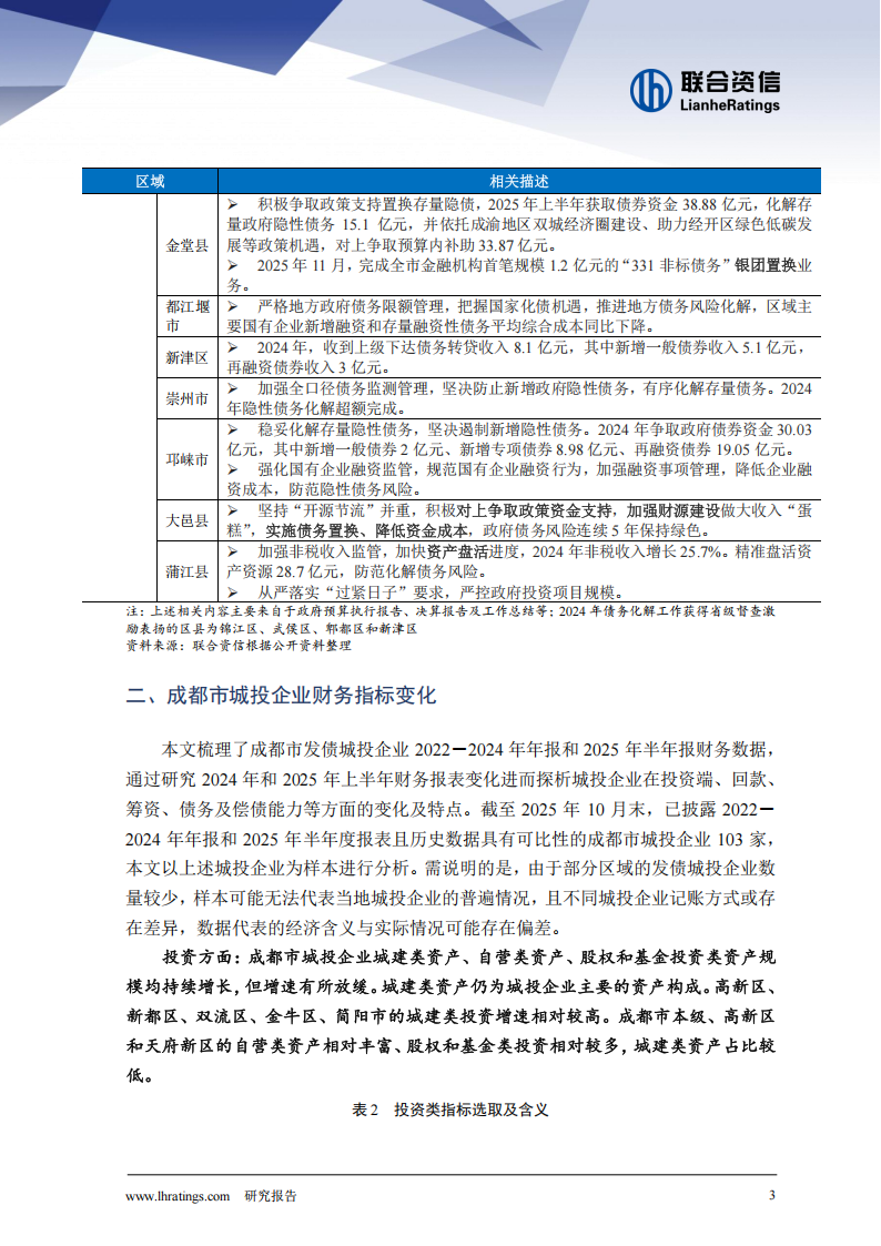 本文梳理了成都市发债城投企业2022-2024年年报和2025年半年报财务数据,通过研究2024年和2025年上半年财务报表变化进而探析城投企业在投资端、回款、筹资、债务及偿债能力等方面的变化及特点。截至2025年10月末,已披露2022-2024年年报和2025年半年度报表且历史数据具有可比性的成都市城投企业103家,本文以上述城投企业为样本进行分析。需说明的是,由于部分区域的发债城投企业数量较少,样本可能无法代表当地城投企业的普遍情况,且不同城投企业记账方式或存在差异,数据代表的经济含义与实际情况可能存在偏差。