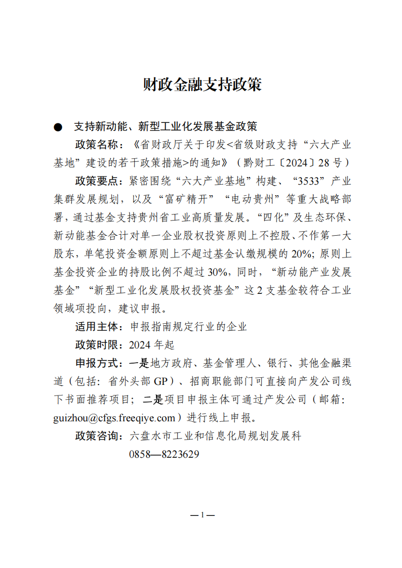 政策名称:《省财政厅关于印发<省级财政支持“六大产业基地”建设的若干政策措施>的通知》(黔财工〔2024〕28号)