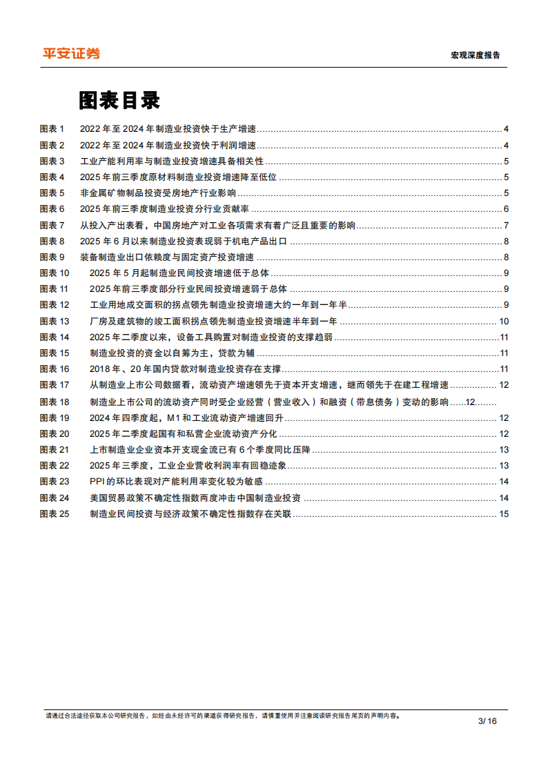 动超过3成,但2025年以来房地产开发投资和房屋新开工面积延续低位运行,拖累原材料制造板块投资弱于总体。第三,装备制造板块投资回落,一定程度上受外部环境不确定性扰动,企业投资规划暂缓。结构上,计算机通信电子、专用设备、电气机械、仪器仪表等出口依赖度较高的行业对制造业投资的贡献率明显回落;汽车制造、通用设备投资贡献率提升,受到以旧换新和设备更新政策的支撑。第四,制造业民间投资相对薄弱。2025年以来,制造业民间投资增速回落,弱于制造业总体。民营企业前期资本开支较快增长,是参与“内卷式”竞争的重要主体。