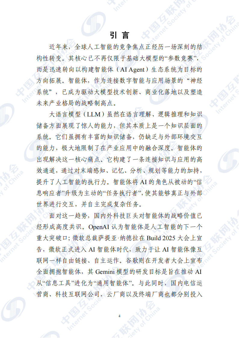 智能体是人工智能打通产业落地“关键一公里”的必然选择,更是“人工智能+”战略落地的“先遣队和主力军”。只有通过技术、产业、政策等多层次的协同攻坚,才能充分释放智能体的变革性力量。为此,协会联合“智能体创新推进计划”合作伙伴单位共同研究撰写了《智能体应用发展报告(2025)》。本报告旨在系统性地剖析智能体从技术创新走向产业应用所面临的核心挑战,并尝试为产业提供跨越阻碍的战略思考及路径,推动我国在“人工智能+”的新浪潮中行稳致远,共同迎接智能体经济时代的到来。
