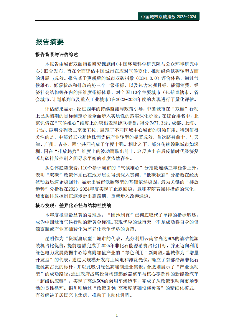 本报告由城市双碳指数研究课题组(中国环境科学研究院与公众环境研究中心)联合发布,旨在全面评估中国城市在应对气候变化、推动绿色低碳转型方面的进展与成效。报告基于更新后的城市双碳指数(CCNI 3.0)评价体系,通过气候雄心、低碳状态和排放趋势三个一级指标,以及包含宏观目标、能源消费、经济社会结构等在内的多维度指标体系,对全国110个主要城市(包括直辖市、省会城市、计划单列市及重点工业城市)在2023-2024年度的表现进行了量化评估。
