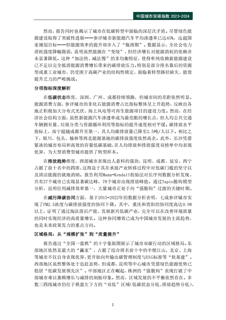 报告通过“全国一盘棋”的十字象限图展示了城市双碳行动的区域格局。东部地区依然是最大的“赢家”,占据了综合排名前十中的半壁江山,北京、上海等城市不仅自身表现优异,更开始向外输出碳管理制度与ESG标准等“软基建”。西部地区虽然整体处于追赶态势,但成都、昆明等中心城市凭借绿色能源优势已稳居“低碳发展领先区”。中部地区正在崛起,株洲的“强脱钩”表现打破了中部城市难以兼顾增长与减排的刻板印象。然而,区域发展的不平衡依然存在。多数三四线城市仍位于棋盘左下方的“双低”区域(低碳状态分低、排放趋势分低),面临着资金、技术与人才的多重短板。