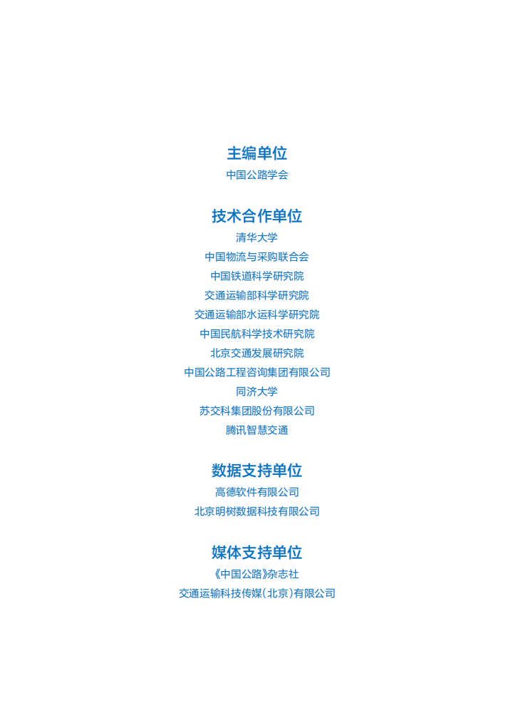 报告编制凝聚了各方的智慧,得到了傅志寰院士的关心支持,得到了陆化普、李兴华、魏际刚、罗庆中、胡华清、施雪松、杨春晖、李平、李忠奎等专家的无私帮助支持,在此向各个技术合作和支持单位、专家以及长期关注报告的朋友们表示衷心的感谢。