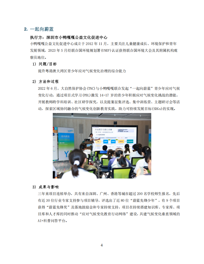 2022年6月,大自然保护协会(TNC)与小鸭嘎嘎联合发起“一起向蔚蓝”青少年应对气候变化行动,通过项目式学习(PBL)激发14-17岁的青少年积极应对气候变化挑战的潜能,开展教师跨学科培训、社区研学探究,以及提案征集评选、集中训练营、主题研讨会等活动,探索区域协同融合的气候变化创新教育实践,助力可持续发展目标(SDGs)的实现。