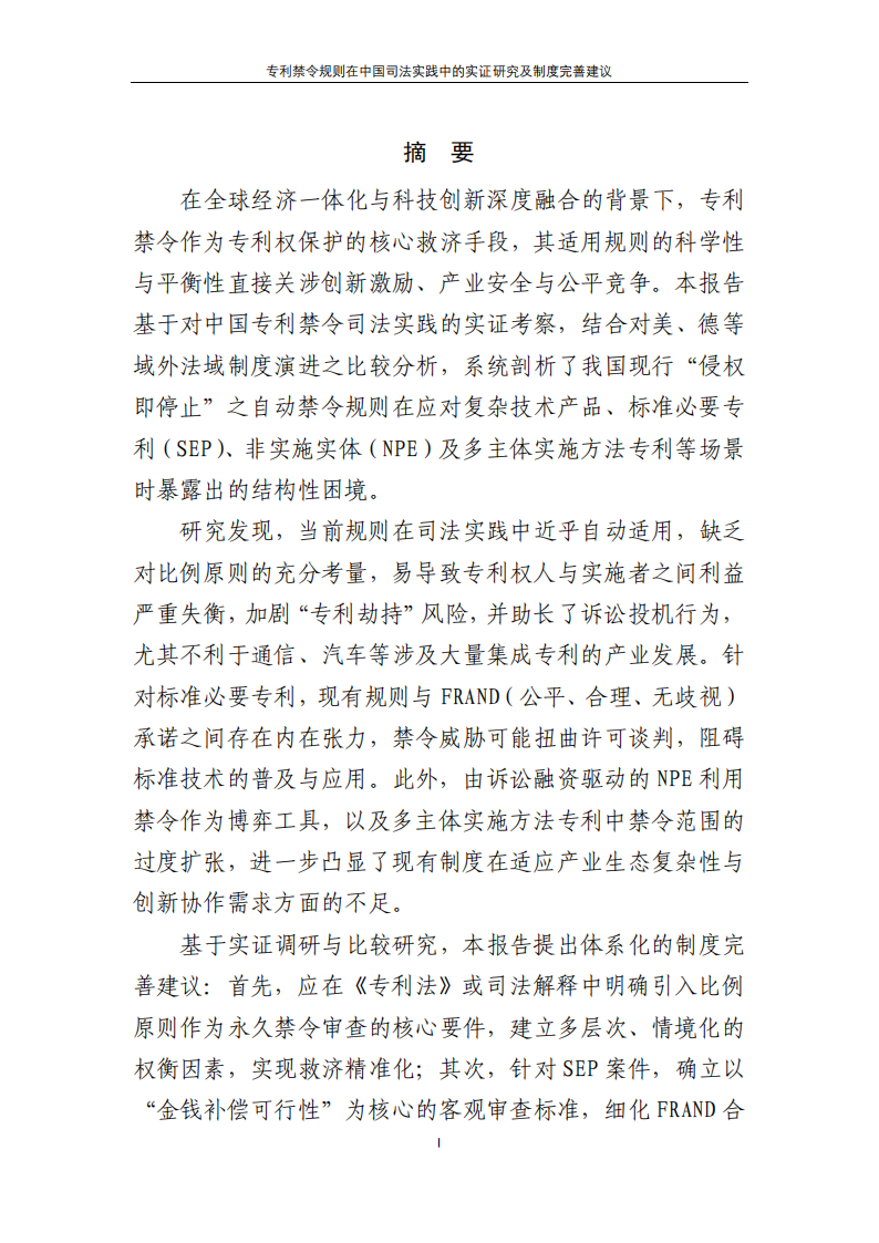 在全球经济一体化与科技创新深度融合的背景下,专利禁令作为专利权保护的核心救济手段,其适用规则的科学性与平衡性直接关涉创新激励、产业安全与公平竞争。本报告基于对中国专利禁令司法实践的实证考察,结合对美、德等域外法域制度演进之比较分析,系统剖析了我国现行“侵权即停止”之自动禁令规则在应对复杂技术产品、标准必要专利(SEP)、非实施实体(NPE)及多主体实施方法专利等场景时暴露出的结构性困境。