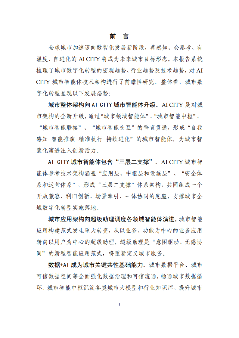 由于AI CITY的技术、生态、应用等仍处在快速发展阶段,我们的认识还有待持续深化,报告中存在的不足之处,欢迎批评指正。全球城市数字化转型迈入数智化发展新阶段。当今时代,人工智能、大数据等新一代数字技术正在纵深发展,并与城市发展的方方面面深度融合、交织共振,成为新一轮城市数字化转型变革的重要驱动力,推动全球城市数字化转型加速迈向数智化发展新阶段。区别于数字化阶段侧重于利用行业应用软件实现行业应用的数字化、网络化,智慧化阶段侧重于基于云化、中台等能力建设推动城市业务流程优化重构的发展模式,城市数字化转型迈入数智化发展阶段的核心特征,是以大模型为代表的人工智能(AI)在数据要素赋能之下,颠覆式构筑基于数据驱动的城市智能决策能力,使城市能通过自主学习和自我优化来进行深层次智能决策和预测推演,推动城市管理流程的系统性变革。AI CITY将成为未来城市全域数字化转型目标形态。AICITY是城市向数智化阶段发展的高阶形态,是智慧城市的下一跳,强调以AI为核心驱动城市全域数字化转型。AI CITY将在四个维度上实现城市数字化转型的跨越式发展:一是在认知智能维度,由需人工干预的辅助智能向自主智能跃迁,通过以AI大模型为代表的AI技术打造自主智能、人机共生的城市智能体,使城市具备自主学习、自主决策并动态适应复杂城市生态的能力。