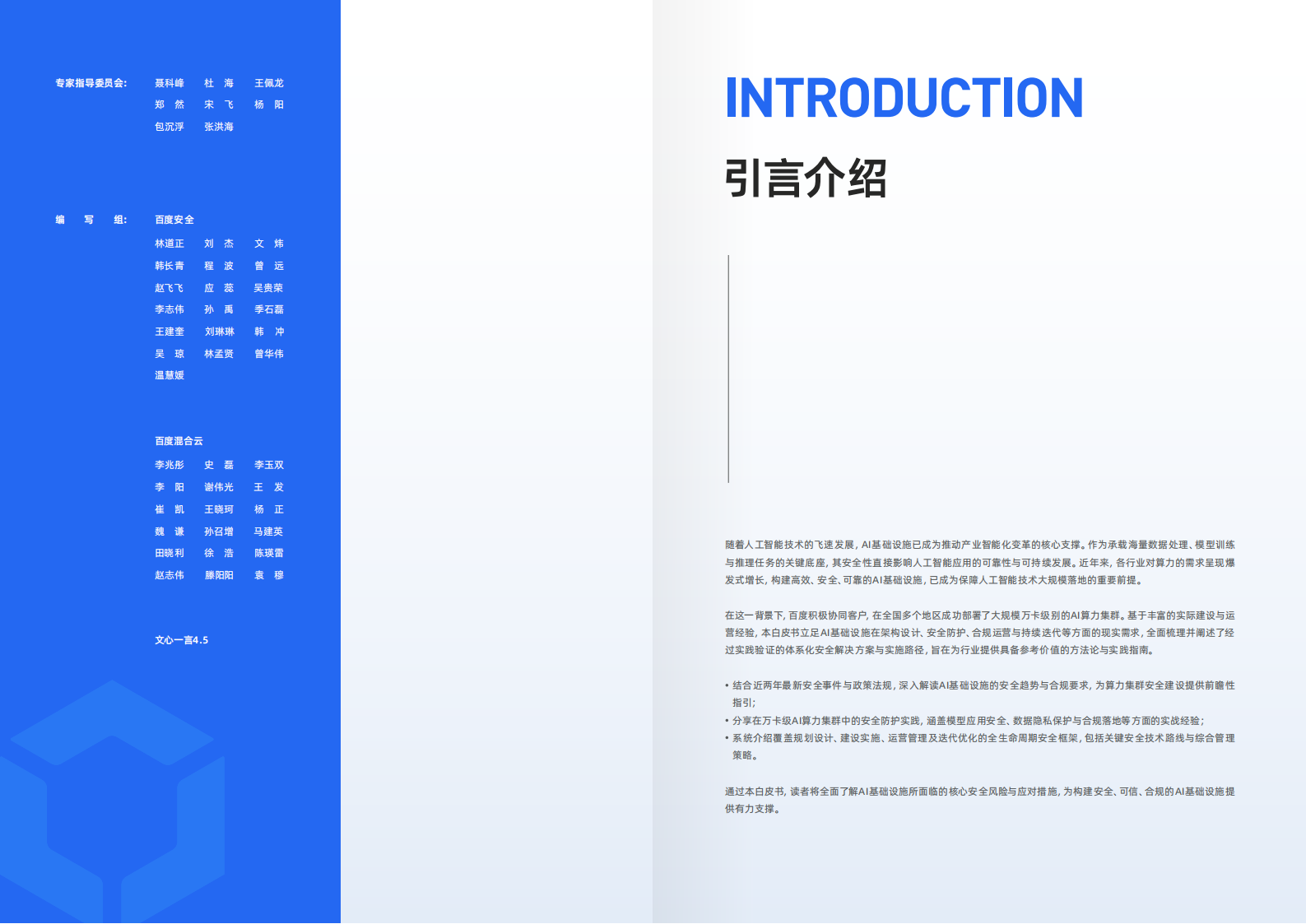 在这一背景下,百度积极协同客户,在全国多个地区成功都署了大规模万卡级别的A算力集释。墨于丰富的实际建设与运营经验,本白皮书立足A墨础设施在菜构设计,安全防护、合规运营与持续选代等方面的现实需求,全面梳理并阐述了经过实践验证的体系化安全解决方案与实施路径,旨在为行业提供具备参考价值的方法论与实践指南。