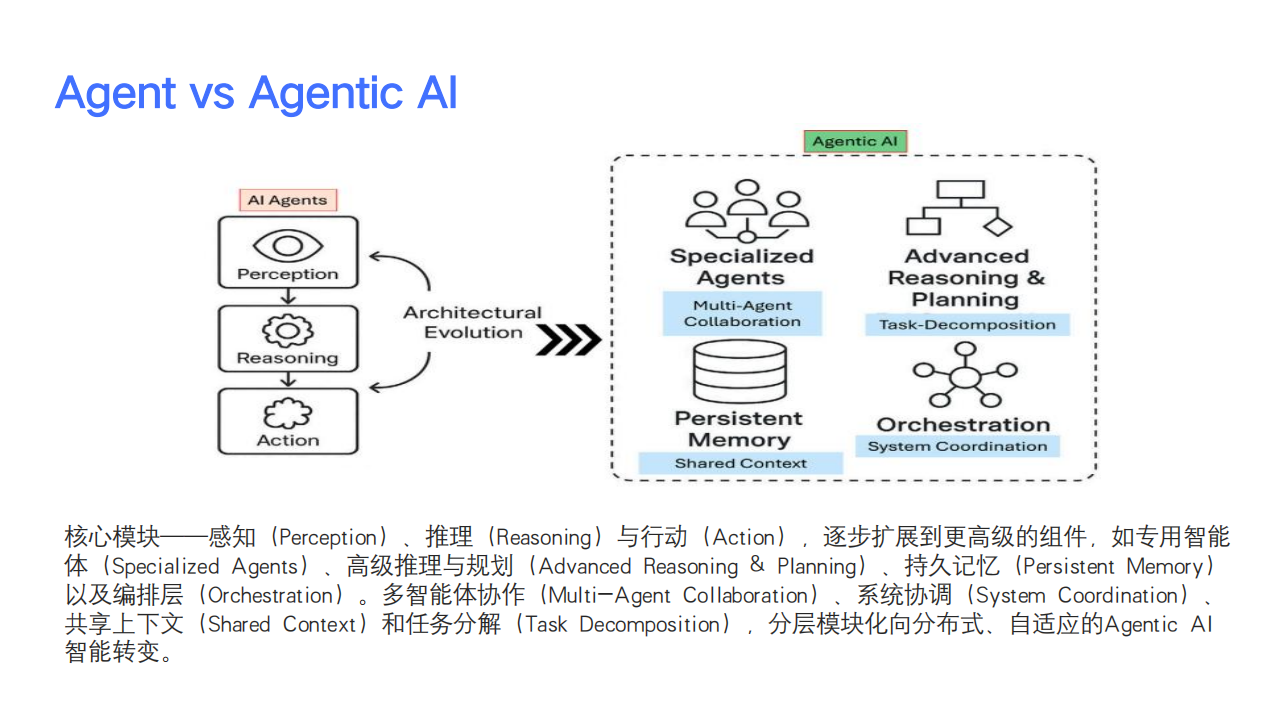 核心模块——感知(Perception) 推理(Reasoning)与行动(Action),逐步扩展到更高级的组件,如专用智能体(Specialized Agents)、高级推理与规划(Advanced Reasoning & Planning)、持久记忆(Persistent Memory)以及编排层(Orchestration)。多智能体协作(Multi-Agent Collaboration)、系统协调(System Coordination)、共享上下文(Shared Context)和任务分解(Task Decomposition),分层模块化向分布式、自适应的Agentic Al智能转变。