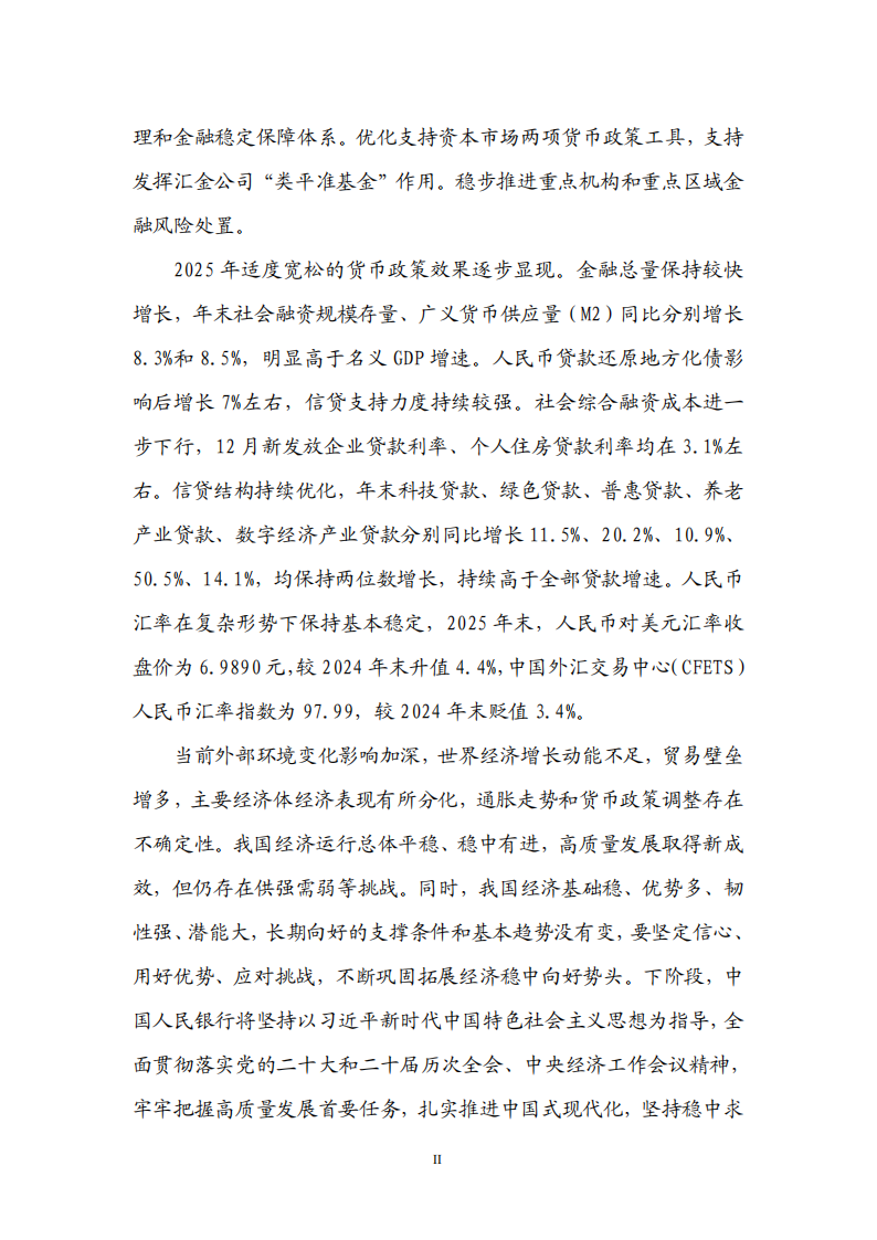 2025年是“十四五”收官之年,在以习近平同志为核心的党中央坚强领导下,国民经济延续稳中有进发展态势,经济社会发展主要目标顺利实现。全年国内生产总值(GDP)同比增长5%。中国人民银行坚持以习近平新时代中国特色社会主义思想为指导,坚决落实党中央、国务院决策部署,实施适度宽松的货币政策,在执行好存量货币政策的基础上,又推出一揽子货币金融政策组合,强化逆周期调节,有效支持实体经济稳定增长和金融市场平稳运行。