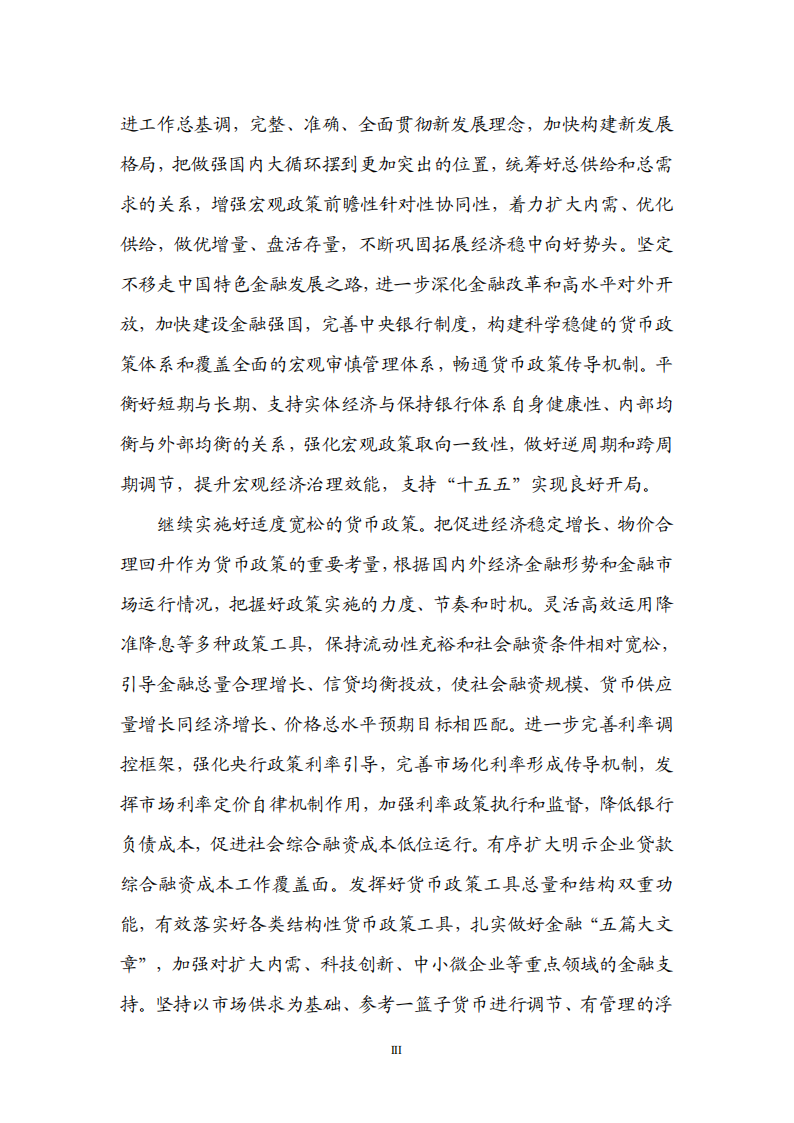 继续实施好适度宽松的货币政策。把促进经济稳定增长、物价合理回升作为货币政策的重要考量,根据国内外经济金融形势和金融市场运行情况,把握好政策实施的力度、节奏和时机。灵活高效运用降准降息等多种政策工具,保持流动性充裕和社会融资条件相对宽松,引导金融总量合理增长、信贷均衡投放,使社会融资规模、货币供应量增长同经济增长、价格总水平预期目标相匹配。进一步完善利率调控框架,强化央行政策利率引导,完善市场化利率形成传导机制,发挥市场利率定价自律机制作用,加强利率政策执行和监督,降低银行负债成本,促进社会综合融资成本低位运行。有序扩大明示企业贷款综合融资成本工作覆盖面。发挥好货币政策工具总量和结构双重功能,有效落实好各类结构性货币政策工具,扎实做好金融“五篇大文章”,加强对扩大内需、科技创新、中小微企业等重点领域的金融支持。坚持以市场供求为基础、参考一篮子货币进行调节、有管理的浮动汇率制度,保持汇率弹性,发挥汇率调节宏观经济和国际收支自动稳定器功能,强化预期引导,防范汇率超调风险,保持人民币汇率在合理均衡水平上的基本稳定。拓展丰富中央银行宏观审慎和金融稳定功能,完善宏观审慎和金融稳定管理工具箱,维护金融市场稳定,坚决守住不发生系统性金融风险的底线。