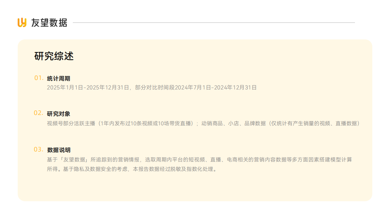 基于「友望报告」所遵循列的营销情报,选取周期内平台的短视频、直播、电商相关的营销内容数据等多方面因素搭建模型计算所得。基于隐私及数据安全的考虑,本报告数据经过脱敏及指数化处理。