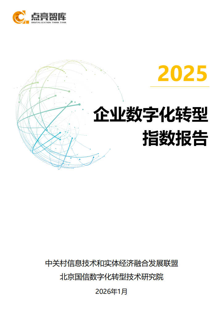 本报告基于DLMM数字化转型成熟度模型,依托覆盖全国31个省(自治区、直辖市)、涵盖19个国民经济门类、93个大类及381个中类的10万余家企业样本,构建了总体指数、区域指数、重点行业指数、国有企业指数和中小企业指数等五大核心成果,全面刻画了我国不同区域、不同行业、不同规模企业的数字化转型发展图景,以及企业在人工智能应用、数字化场景落地、数据要素价值释放等关键领域的实践现状。数据显示,2025年我国企业数字化转型整体处于“全面深化“期,全国超过15%企业已经步入实质性转型阶段,企业数字化转型成熟度指数达到35.4。虽然不同区域、行业、规模企业转型进程不一,但在技术融合应用、管理优化变革、数据要素开发、数字能力提升、业务创新转型等方面取得了积极进展。